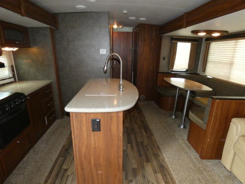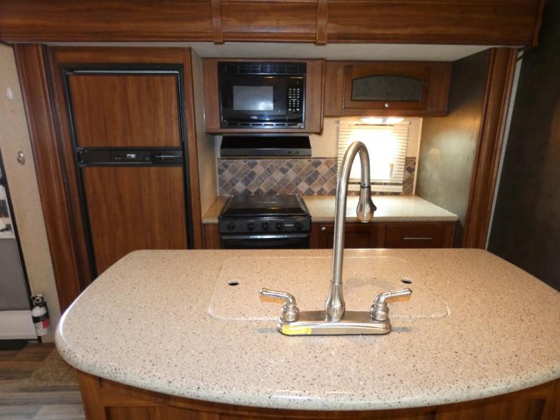 In the combined kitchen and living space the dual opposing slides give it an open concept feel. The slide to the left of the door features a refrigerator, three burner range and counter space with overhead cabinets. The kitchen island nearby provides a bit more work space and a double kitchen sink makes cleaning up a cinch.