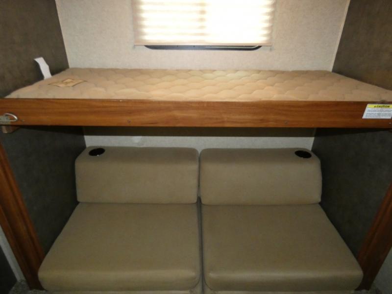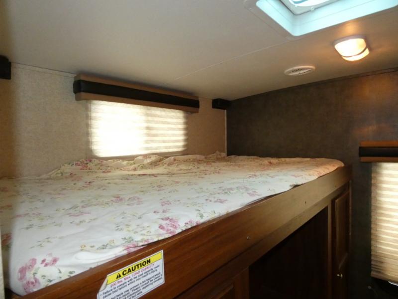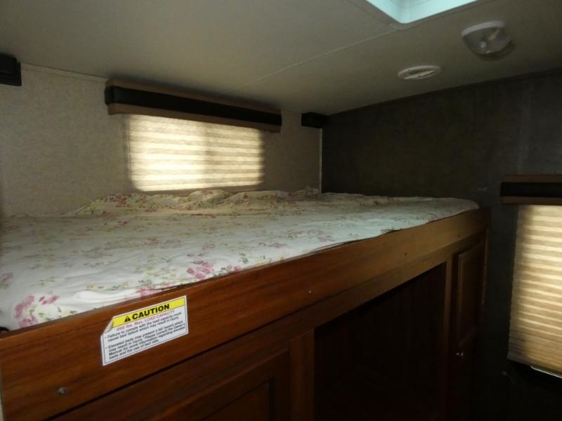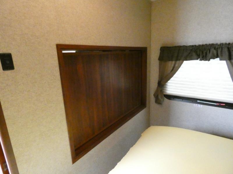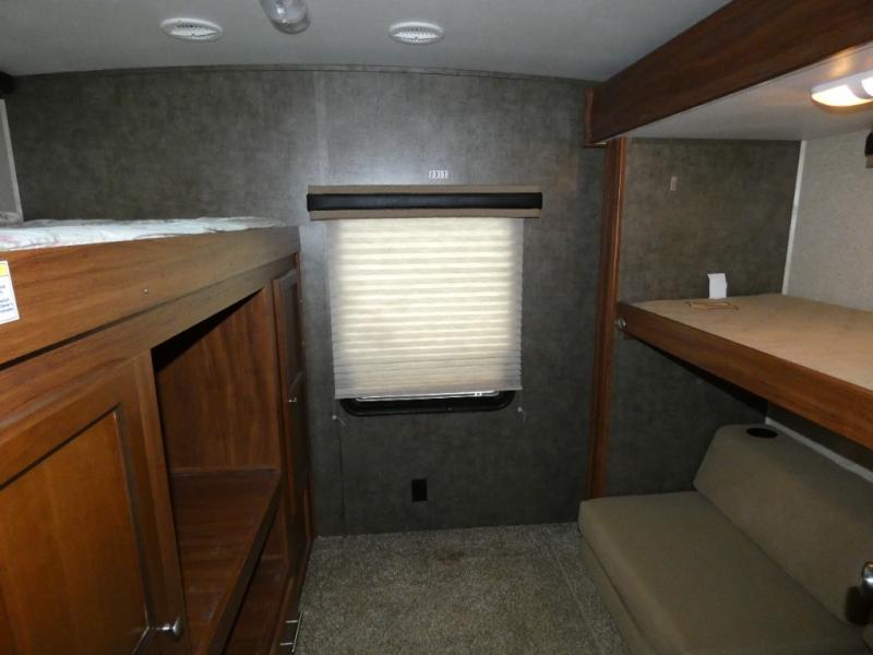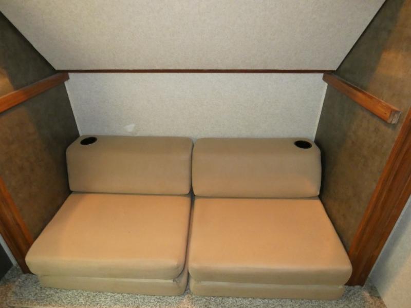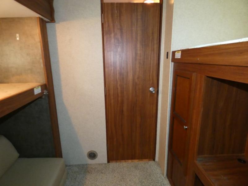 The rear bunkhouse makes taking along extra family and friends simple. There is a set of bunks that slide out on the right, and a second set of bunks on the left. Beneath the bunks is a exterior kitchen that makes cooking and dining outdoors a real treat. You will find a sink, refrigerator, counter space, and so much more in this North Trail King 33BKSS travel trailer.