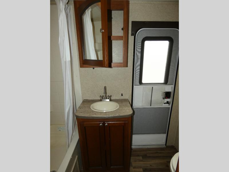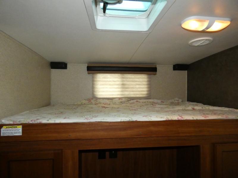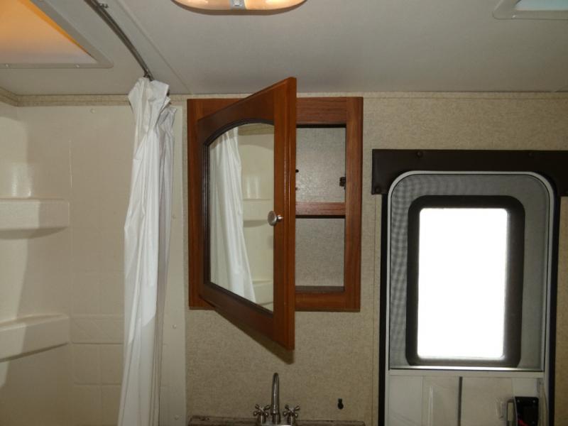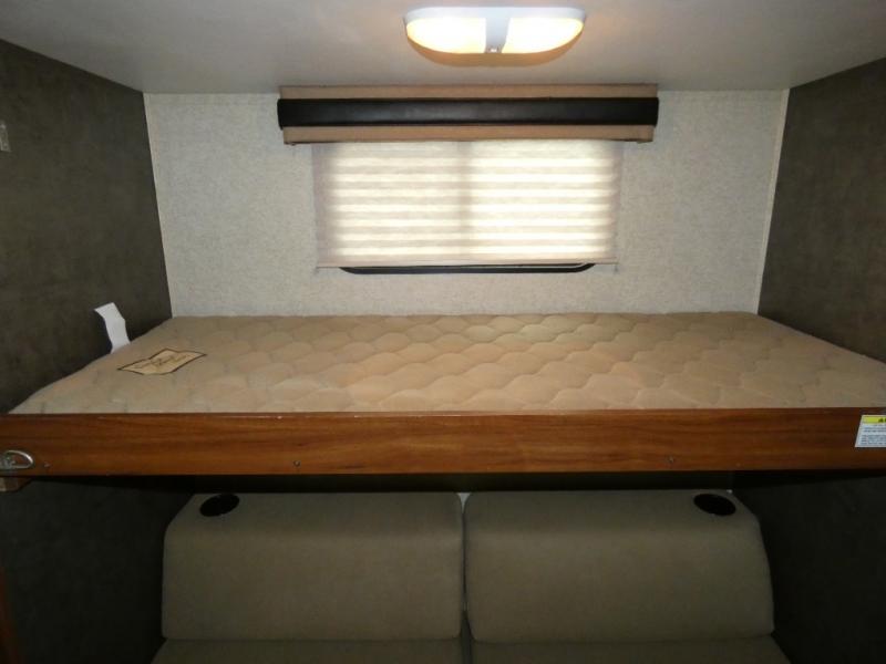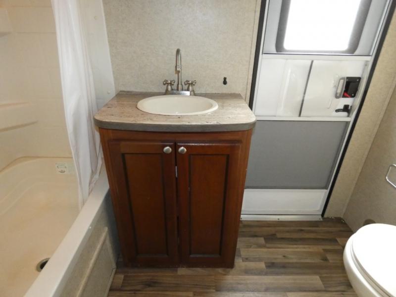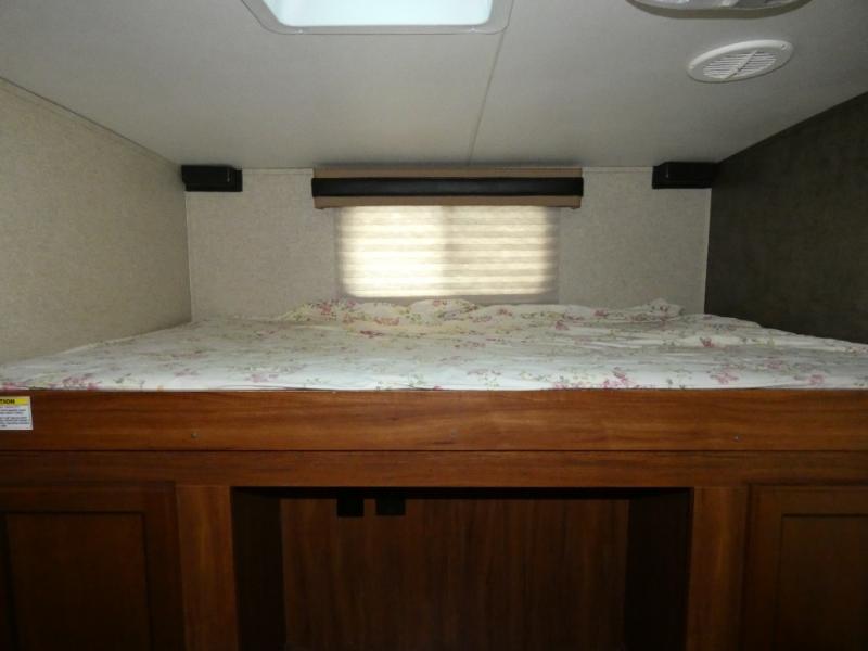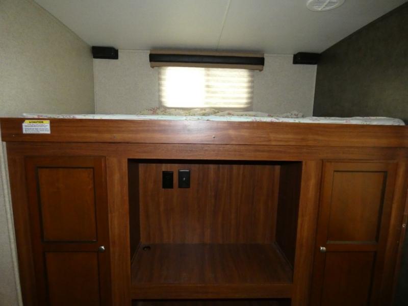 The rear bunkhouse makes taking along extra family and friends simple. There is a set of bunks that slide out on the right, and a second set of bunks on the left. Beneath the bunks is a exterior kitchen that makes cooking and dining outdoors a real treat. You will find a sink, refrigerator, counter space, and so much more in this North Trail King 33BKSS travel trailer.