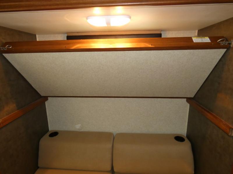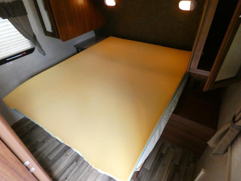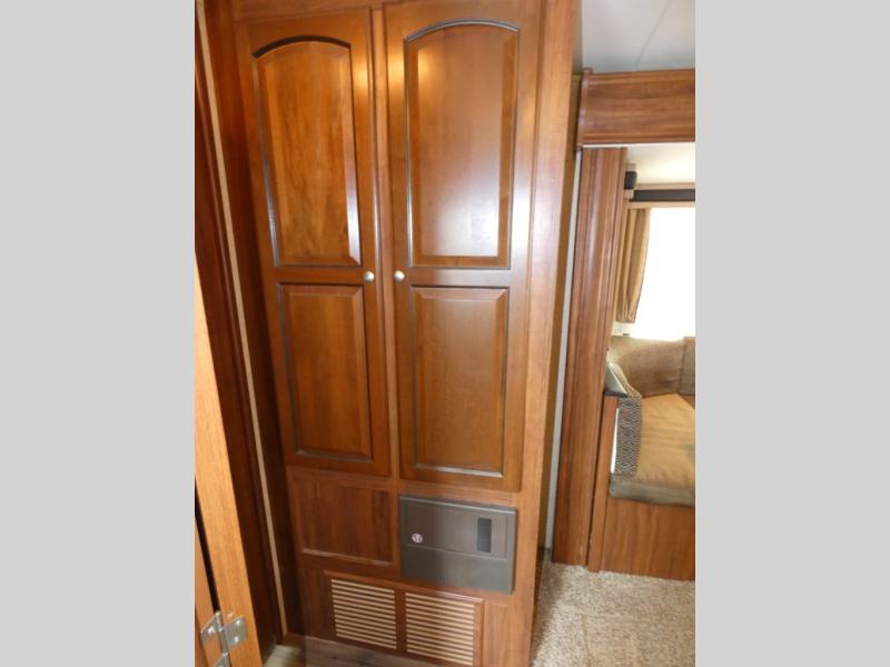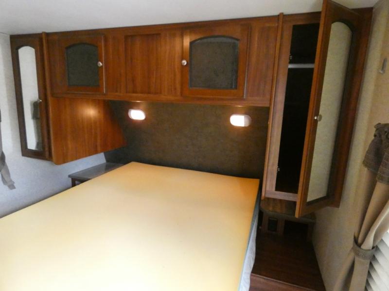 Enter the side door furthest to the front and see a master bedroom to the right of the door. Inside find a queen size bed with nightstands and wardrobes on either side, plus additional storage above.