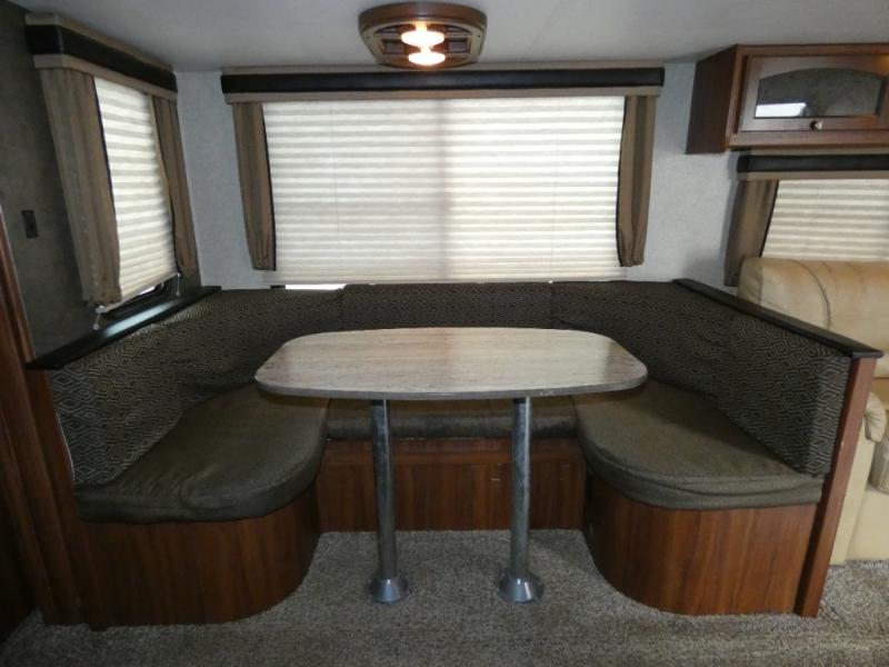 The slide opposite features a large u-shaped dinette and sofa with overhead storage. And, just off the slide is a large pantry for storing dry goods and more.
