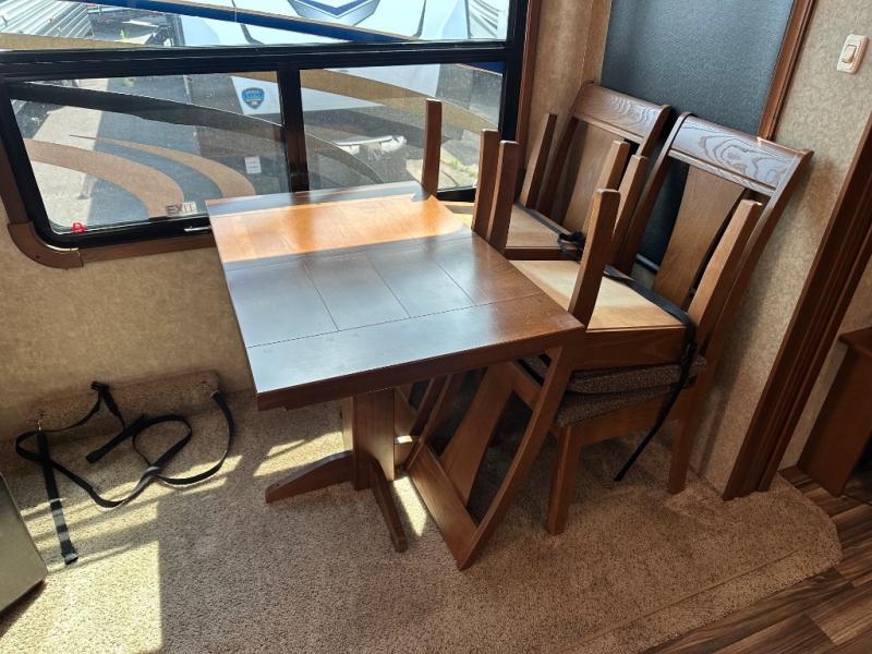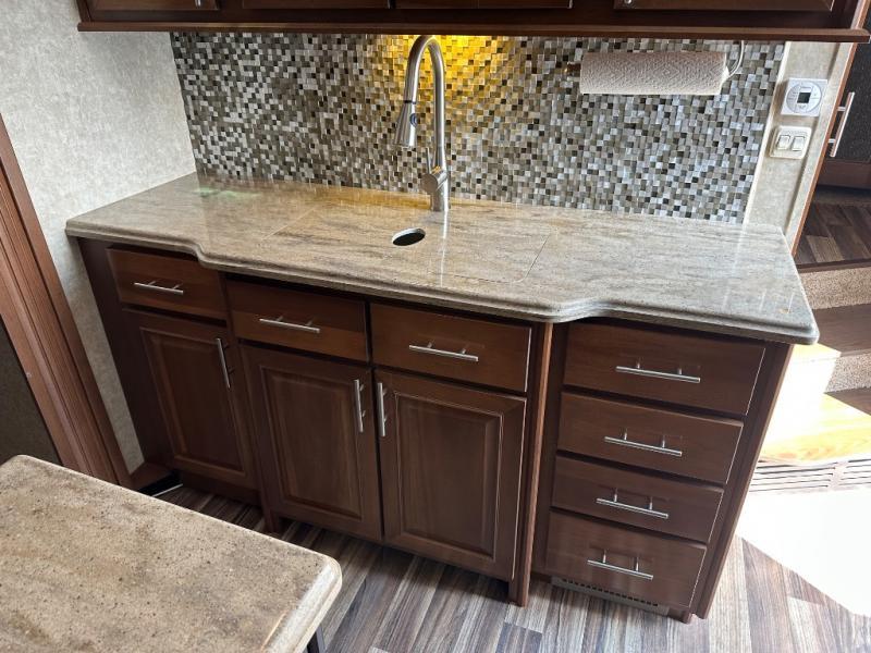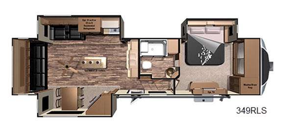 Enter model 349RLS and see how open the space is with dual opposing slides in the living and kitchen area combined. There is a slide out to the left of the door featuring a corner entertainment center, and dining table with four chairs. There is also a counter area with double kitchen sink straight in from the door.