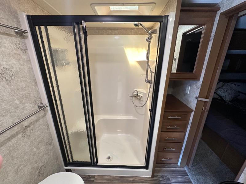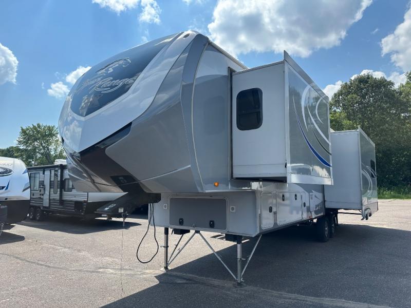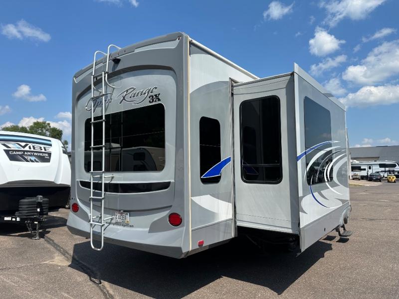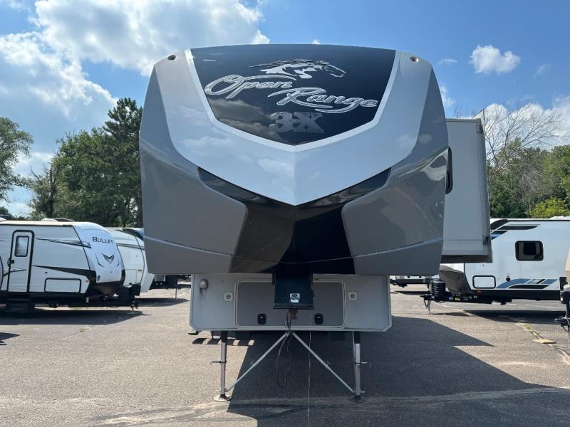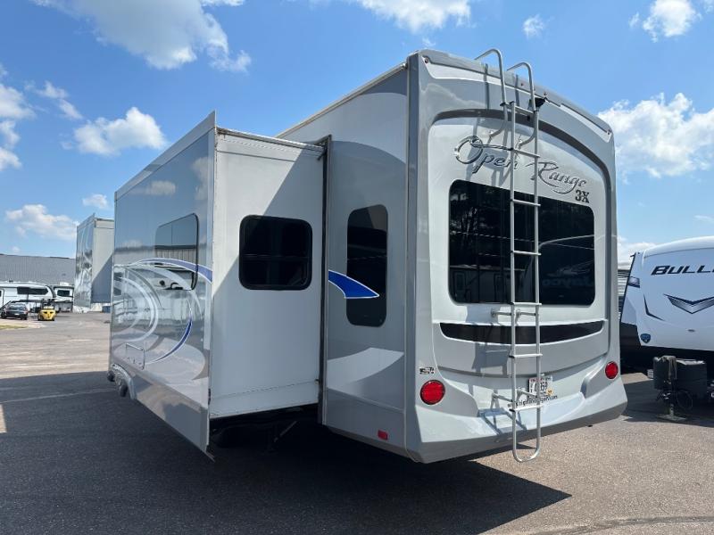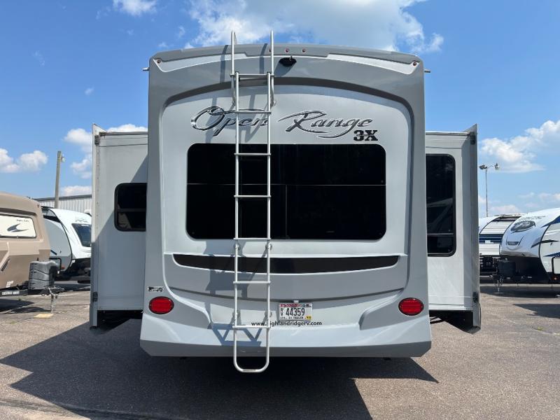 This Open Range 3X fifth wheel features dual opposing slides in the rear living area providing lots of space for entertaining or relaxing, a front bedroom slide out with access to the bath, plus much more!