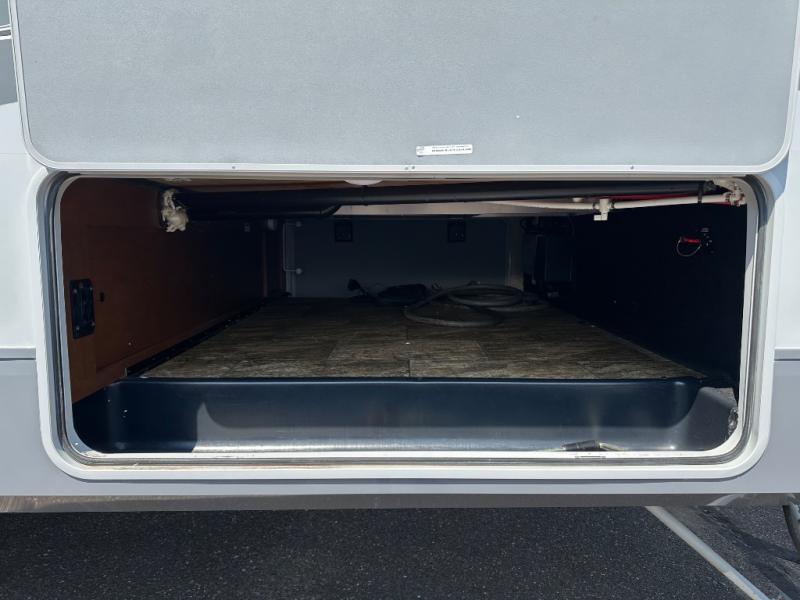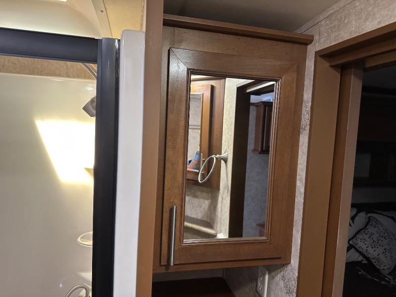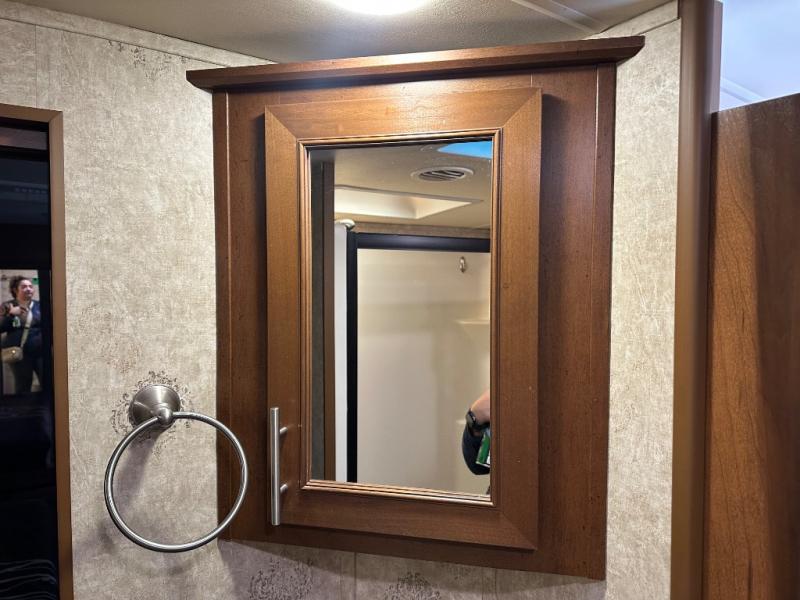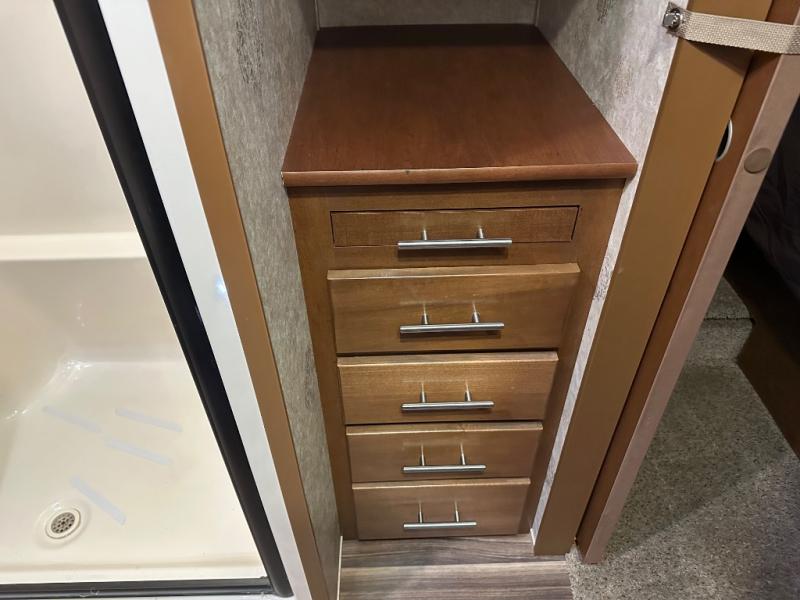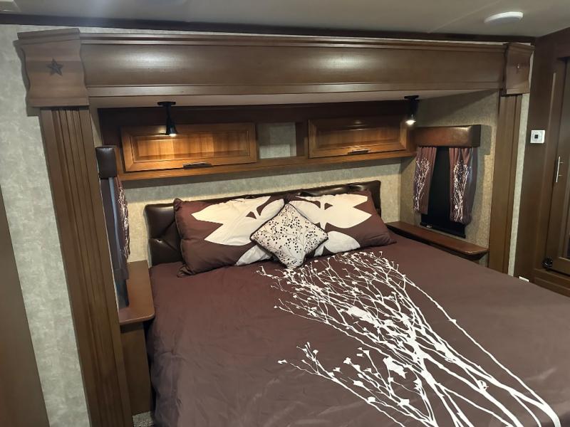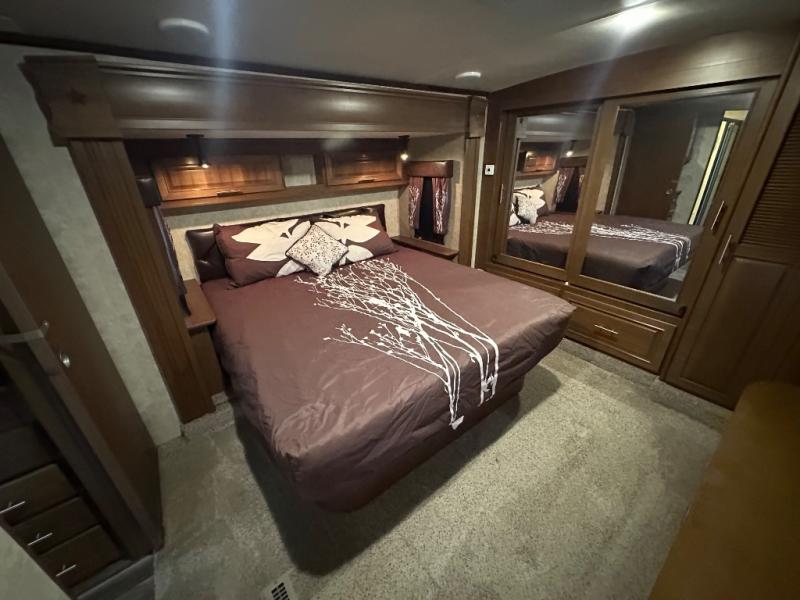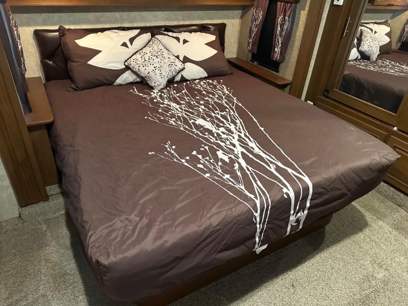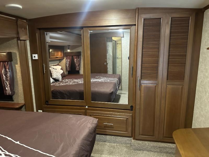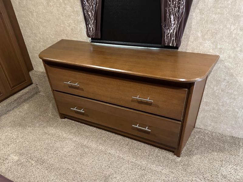 The master bedroom also has an entry at the head of the hall. Inside find a king size bed slide out with nightstands on either side, a chest of drawers with optional TV above, and a front wall wardrobe with sliding mirrored doors, plus a closet that has been prepped with a washer and dryer for added convenience.