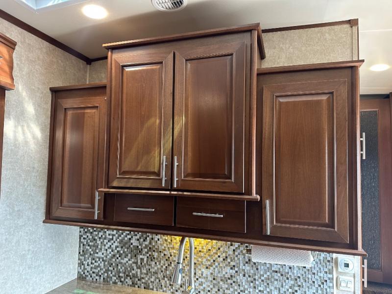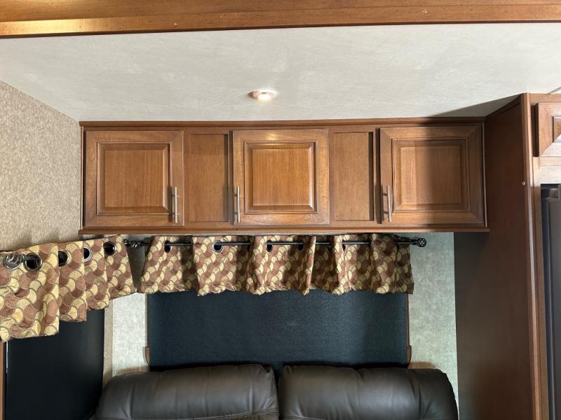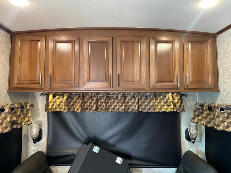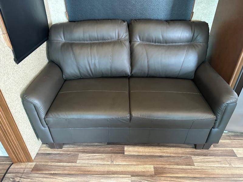 The rear of this fifth wheel provides more seating with a sofa including overhead cabinets.