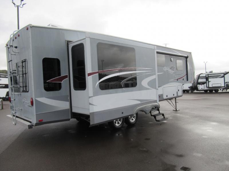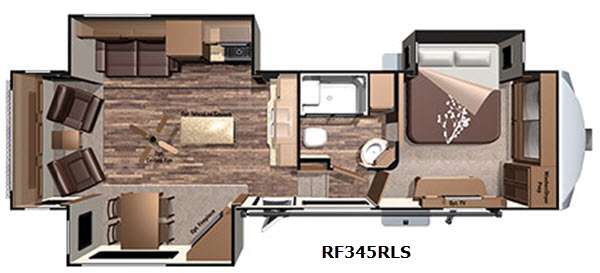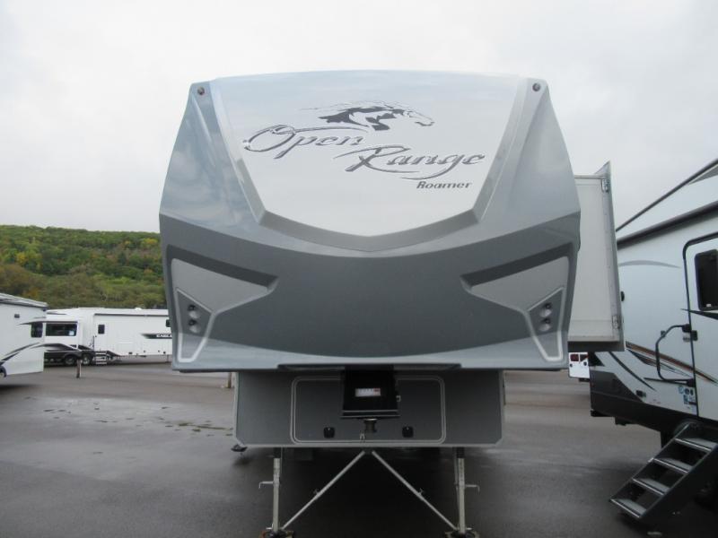 This Open Range Roamer fifth wheel RF345RLS by Highland Ridge RV features a rear living area, triple side outs, a king size bed, and an optional kitchen island.