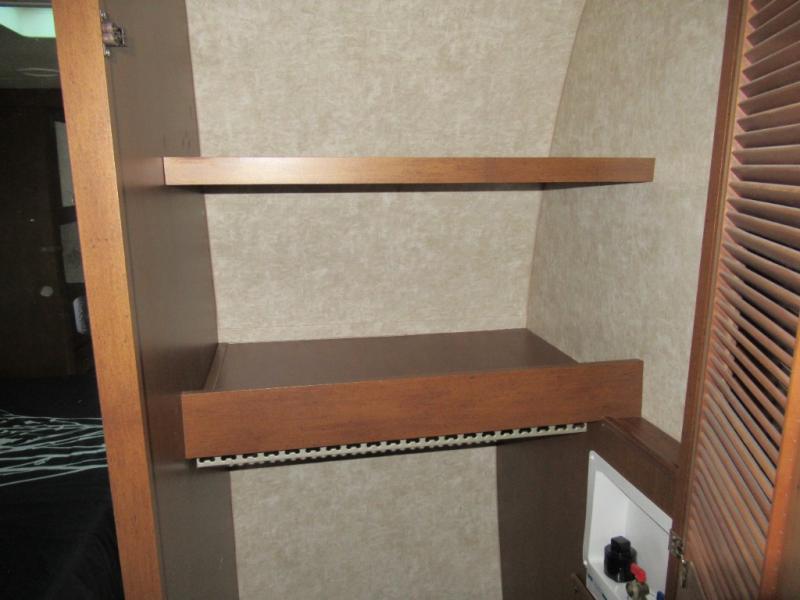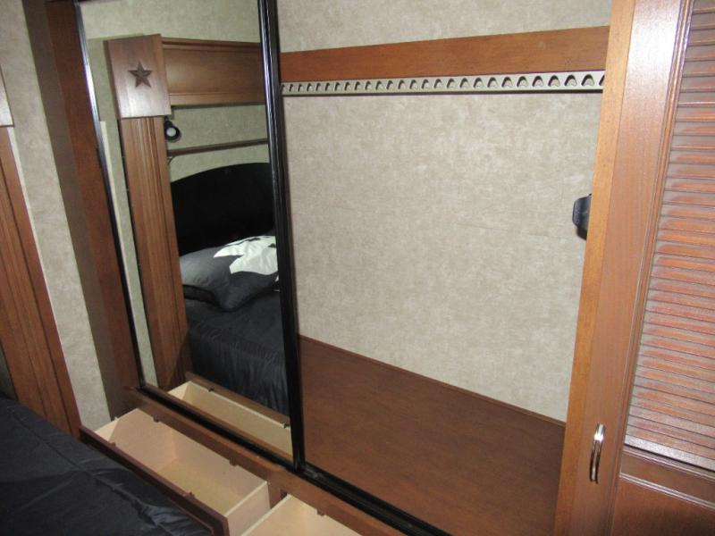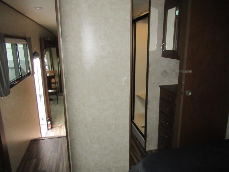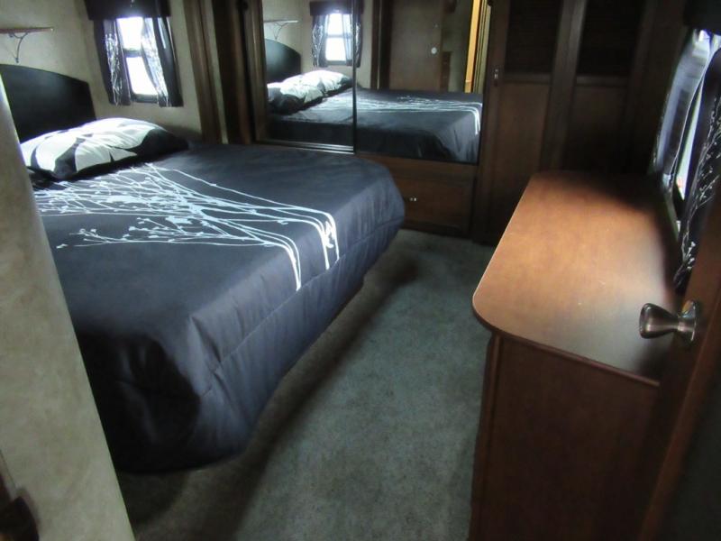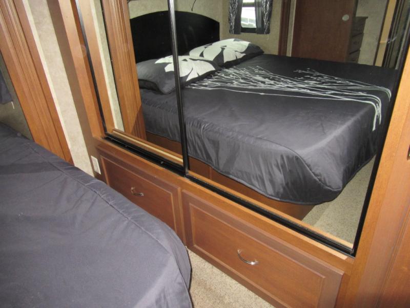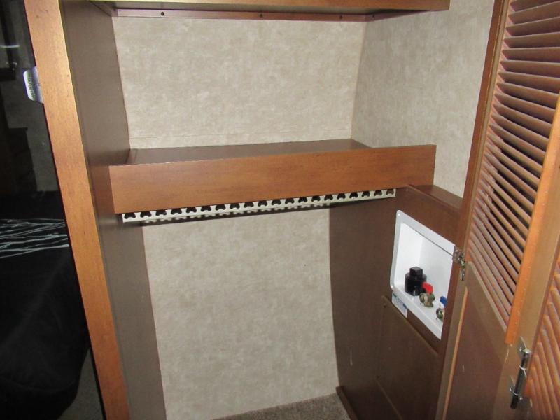 The private front bedroom features a king size bed slide out. There is a chest of drawers on the opposite wall with optional TV above. You will also find plenty of storage in the front wardrobe with sliding mirrored doors, and a closet that has been prepped for a washer and dryer.