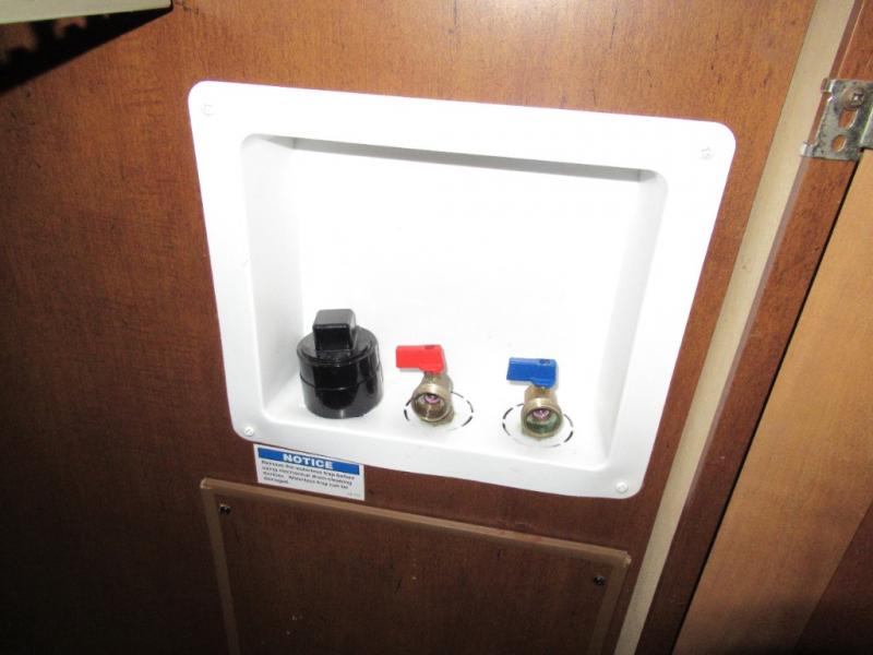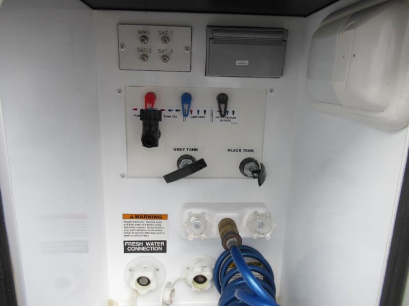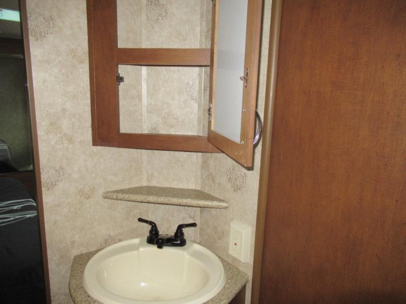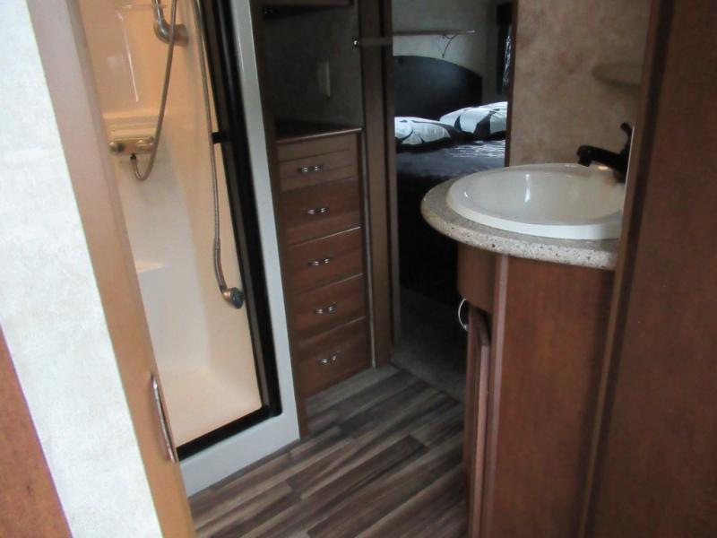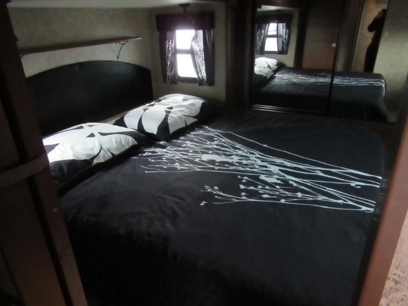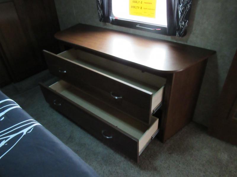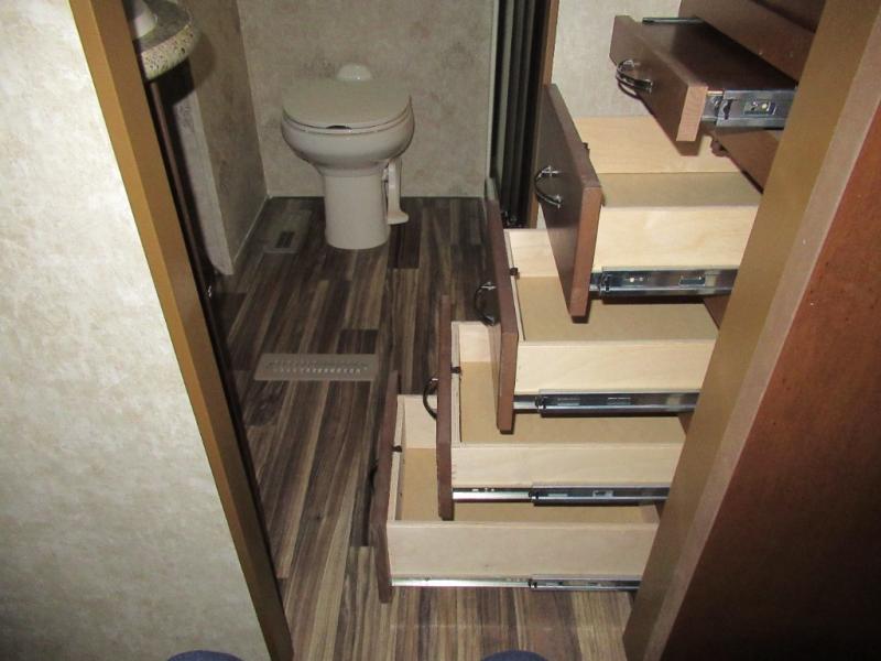 The private front bedroom features a king size bed slide out. There is a chest of drawers on the opposite wall with optional TV above. You will also find plenty of storage in the front wardrobe with sliding mirrored doors, and a closet that has been prepped for a washer and dryer.