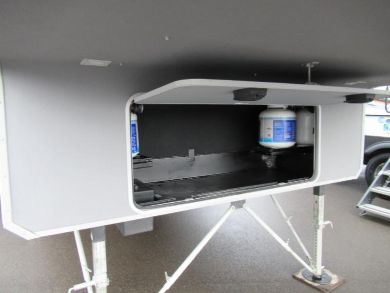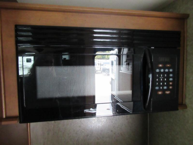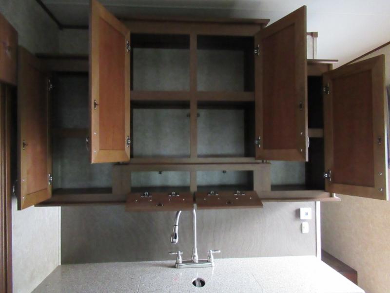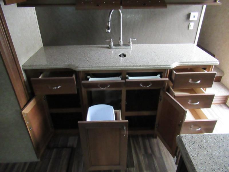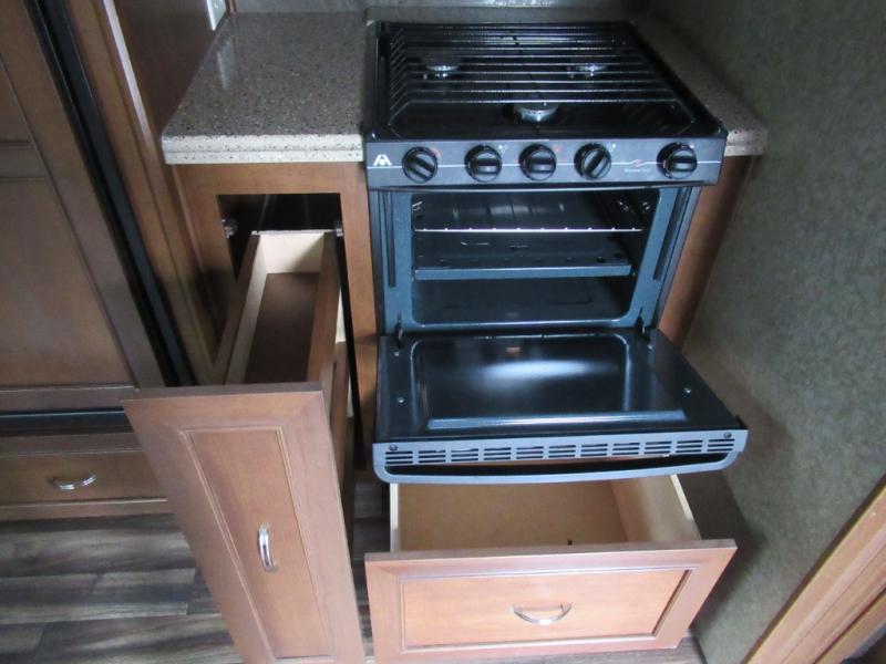 A second living/kitchen area slide on the opposite side features a sofa, refrigerator, and three burner range with microwave oven. There is also a counter area on the interior wall where you will find a double sink, overhead cabinets, and base cabinet storage also. An optional kitchen island on castors is available as well.