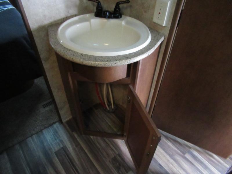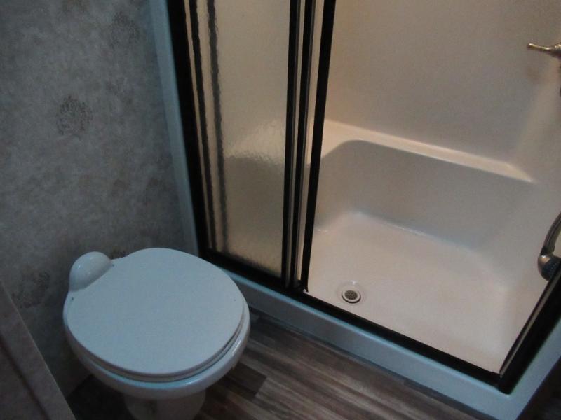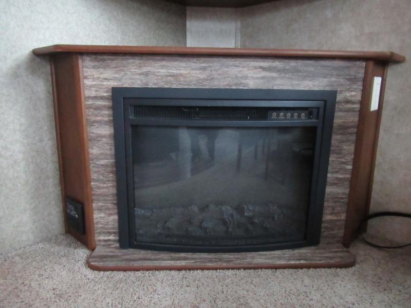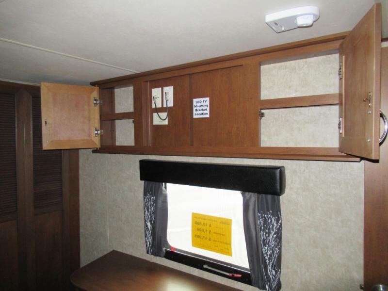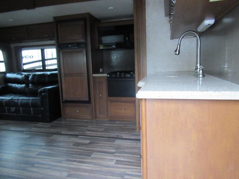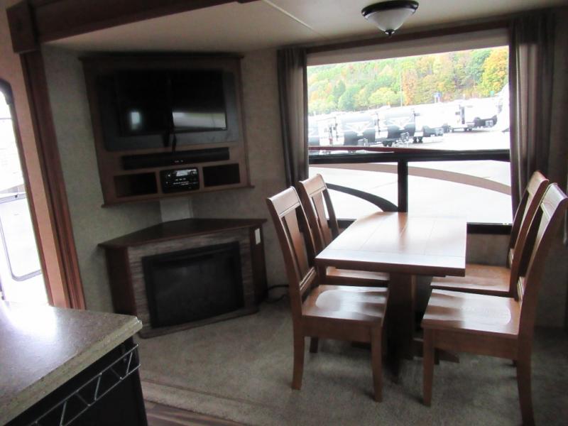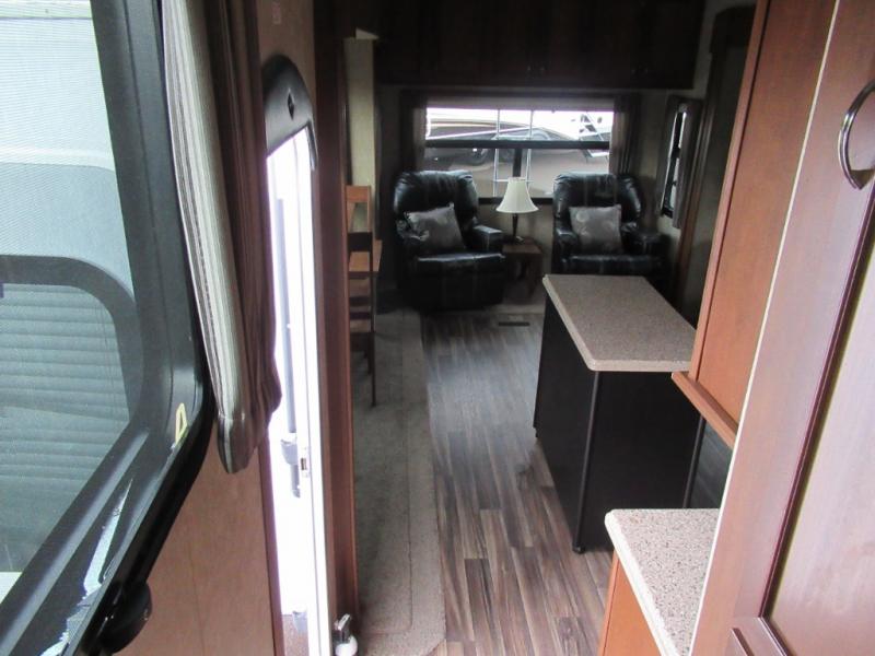 Step inside and find a wide open kitchen and living space that feels a lot like home. There is a slide out entertainment center and dining table and chairs to the left of the entry door.