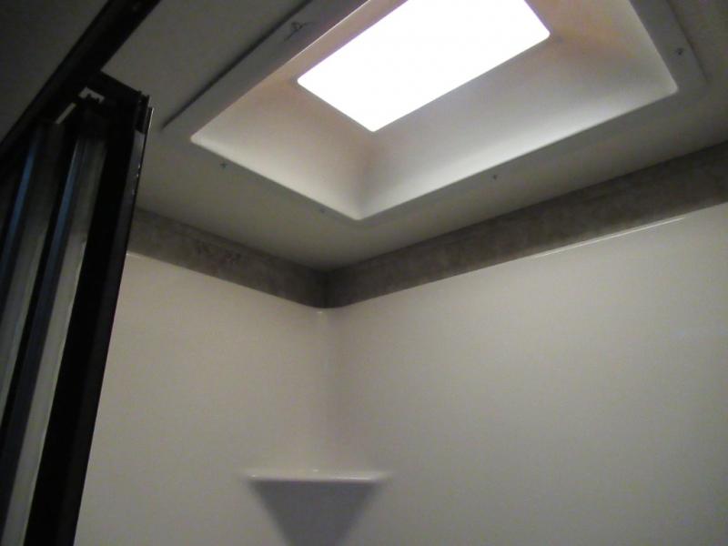Step up two steps to the right of the entry door and find a full bath with toilet, sink, linen cabinet, and a shower. The bath has dual entry doors and can be accessed from the hall or from within the bedroom up front.