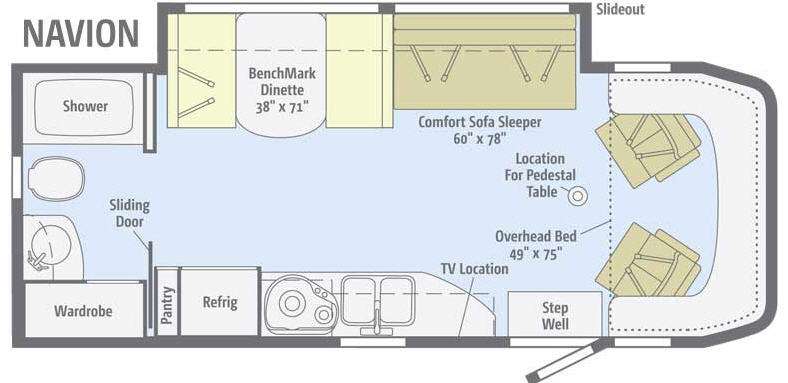 Itasca Navion Class C Diesel Coach w/Rear Full Bath Including: Shower, Toilet, Sink w/Overhead & Wardrobe, Sliding Door, Pantry, Refrig., BenchMark Dinette & Comfort Sofa/Sleeper Slideout, Pedestal Table, Front Overhead 49" x 75" Bed, 26" LCD TV, Dbl. Kitchen Sink, 2 Burner Cooktop, and Much More! Available Options May Include: Front Overhead Storage Cabinet.