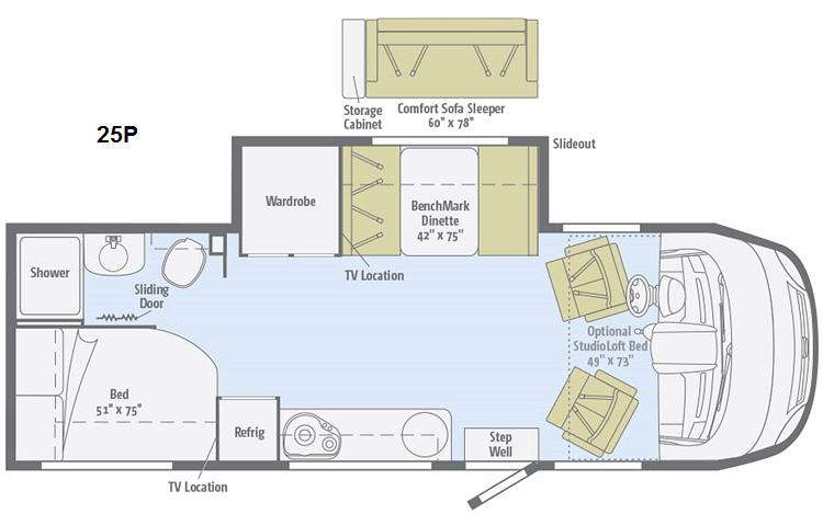 Step inside and see a BenchMark 42" x 75" dinette directly across from the door. It is featured in a single slide out along with a large wardrobe for storage. There is also a 32" HDTV for your viewing pleasure. You can choose a Comfort Sofa sleeper and storage cabinet instead if you like.
