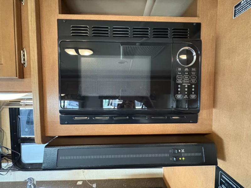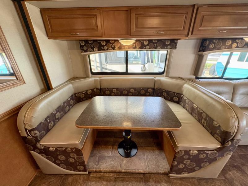 As you enter notice the amount of living space with the large slide fully extended. There is a sofa/bed and u-shaped dinette both with seat belts, and overhead cabinets above the sofa/bed for your things.