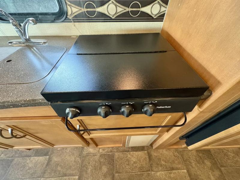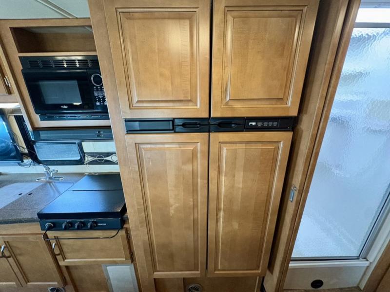 To the left of the main entry find a counter area with location for an optional flat screen 32" HDTV, a double sink, three burner range, pantry, and refrigerator for all of your food prep and cooking needs.