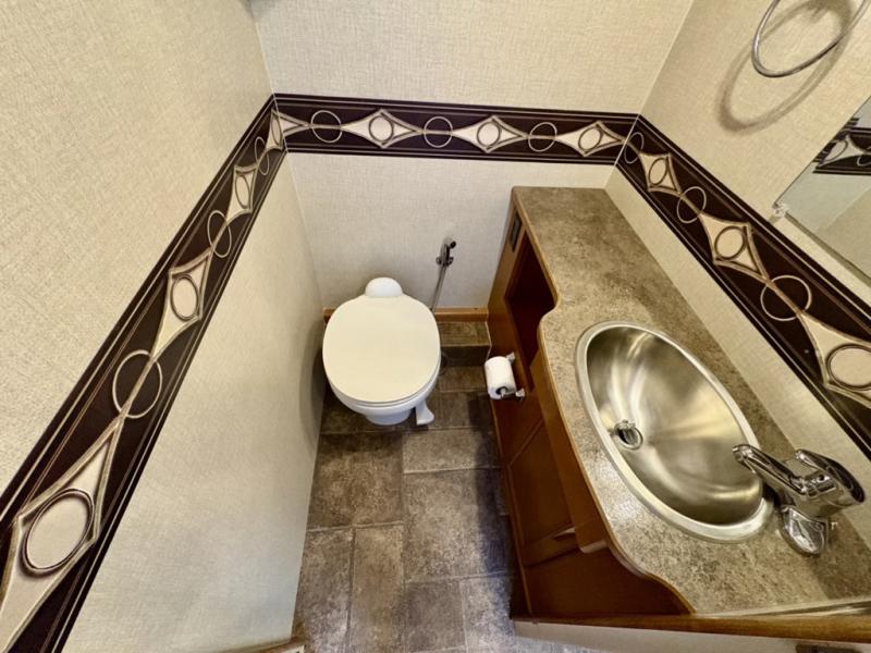Next, a sliding door leads to the rear bedroom and bath that features a shower on the left and a private toilet area and vanity with sink on the right.