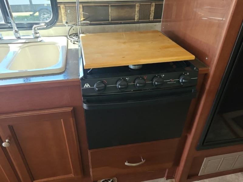 To the left of the entry door there is a counter area with location for a 32" HDTV, a double kitchen sink, and a three burner range, plus refrigerator. If you need more sleeping space choose the optional Studio Loft 32" x 79" bed that can be manually lowered, or choose a powered bed that is 32" x 89".