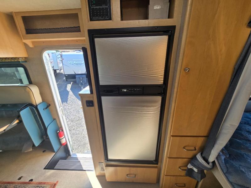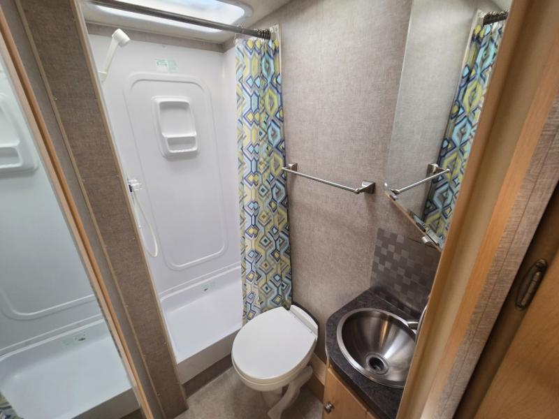 In the rear curb side corner find a queen size bed with single StudioLoft bed above. The right road side corner offers a bath complete with shower, toilet, and sink with overhead storage. There is a wardrobe for your clothing just outside the bathroom door, plus so much more!