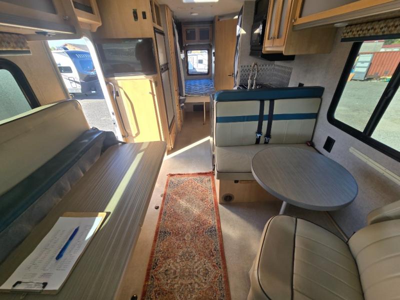 Step inside and find a 28" HDTV mounted just inside the door on your left. There is a 40" x 74" multi-functional sofa bed to the right of the entry door. A round pedestal table and a third chair makes a nice conversation area with the cab seats swiveled around. Enjoy overhead storage above the sofa bed and a Studio Loft bed is available for additional sleeping space above the cab area too. Plus there is a booth dinette seat for two and table to enjoy your meals at.
