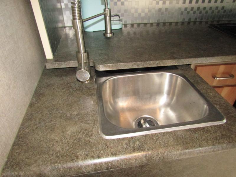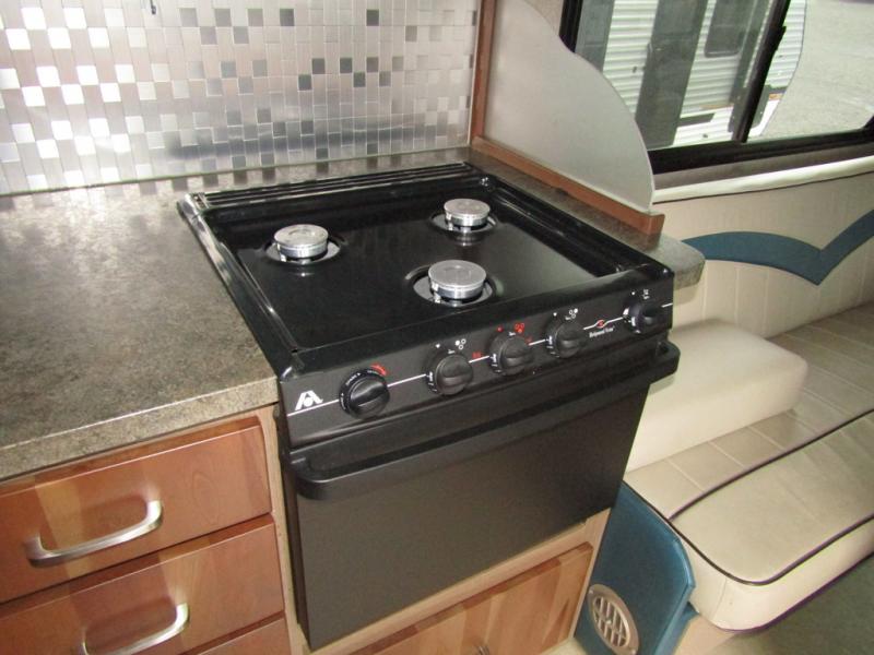 You will easily be able to cook in this Tribute kitchen. There is a food storage pantry, residential refrigerator to the left of the door, and a three burner range, counter space, and double kitchen sink. There are also plenty of overhead cabinets for storage as well.