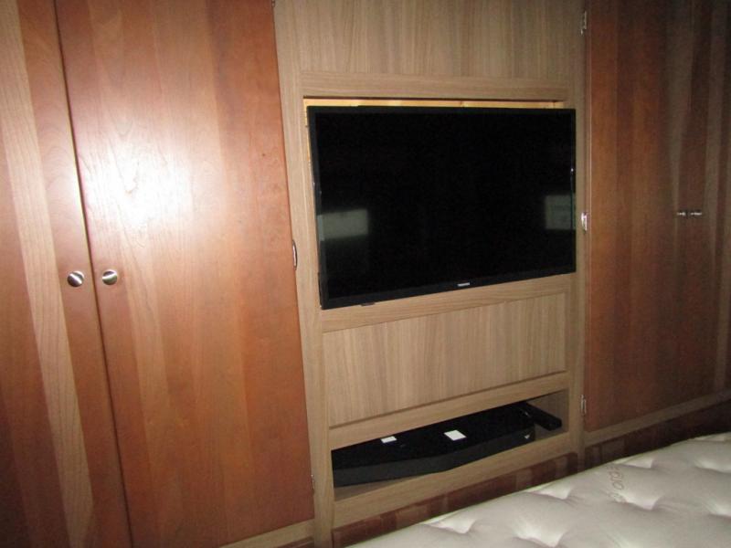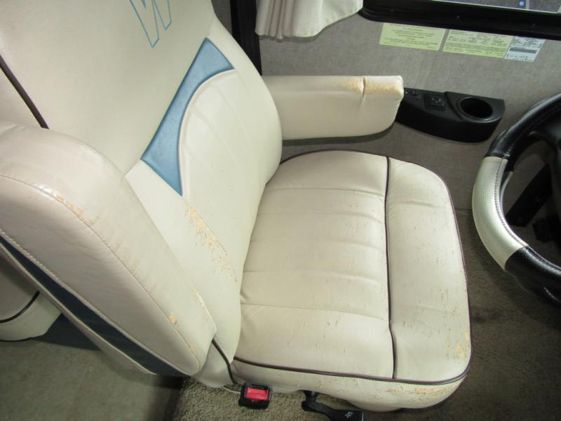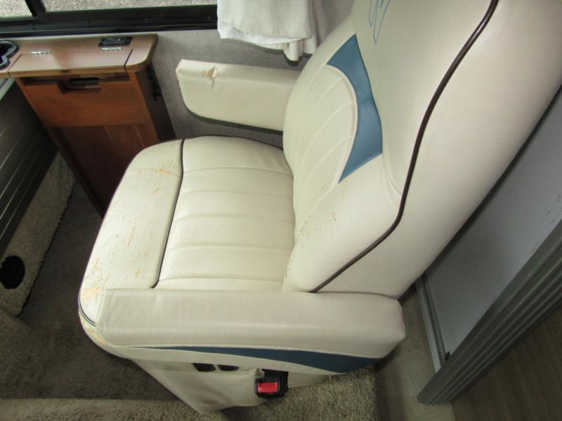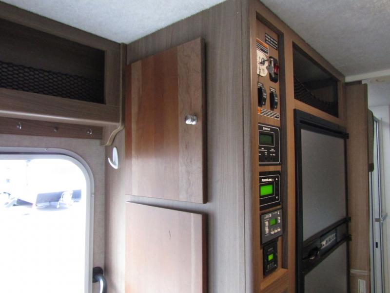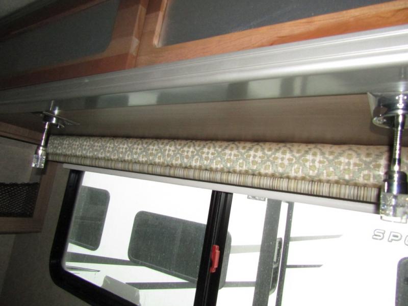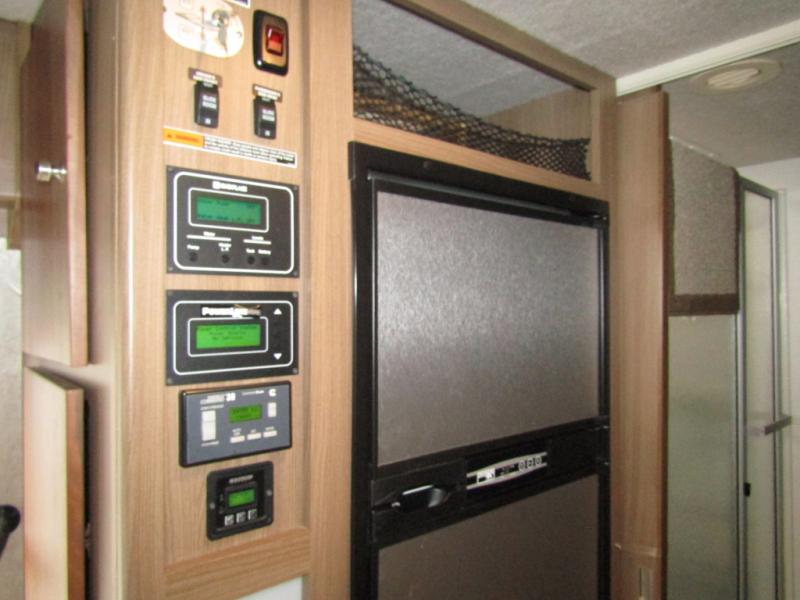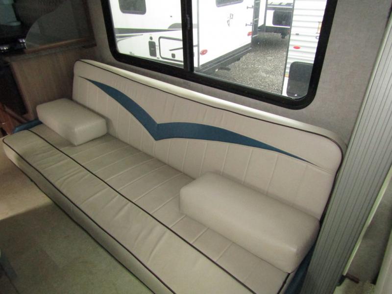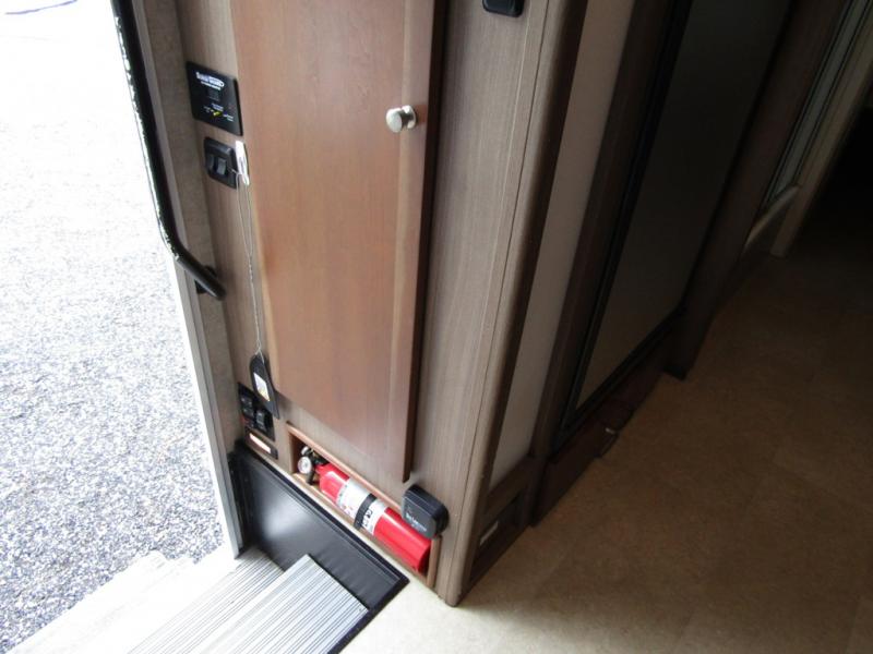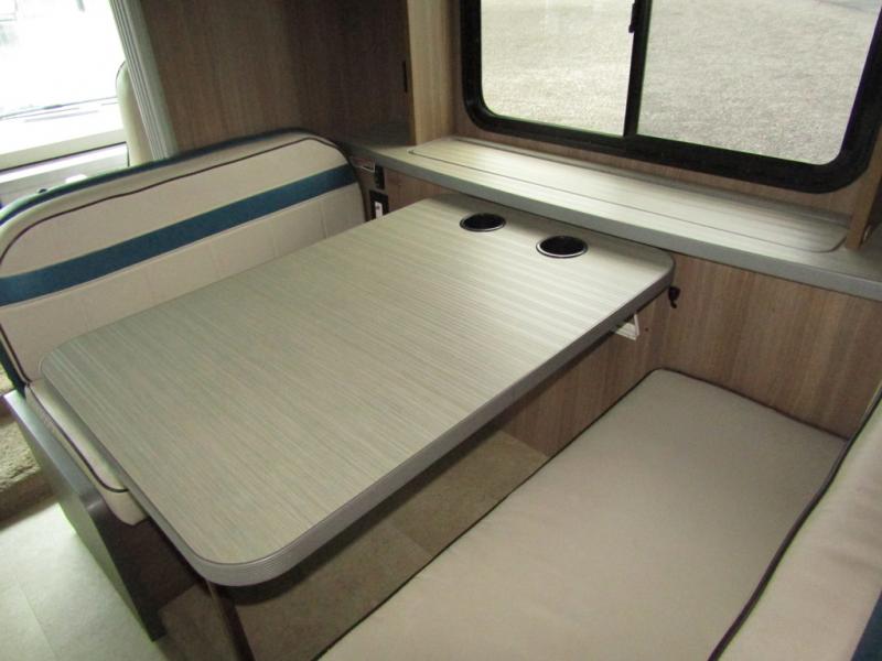 Model 31C features a side entry door that opens into a spacious front living and kitchen area. There is a slide out dinette to the left as you enter including a buffet with retractable TV locations, plus overhead cabinets as well.