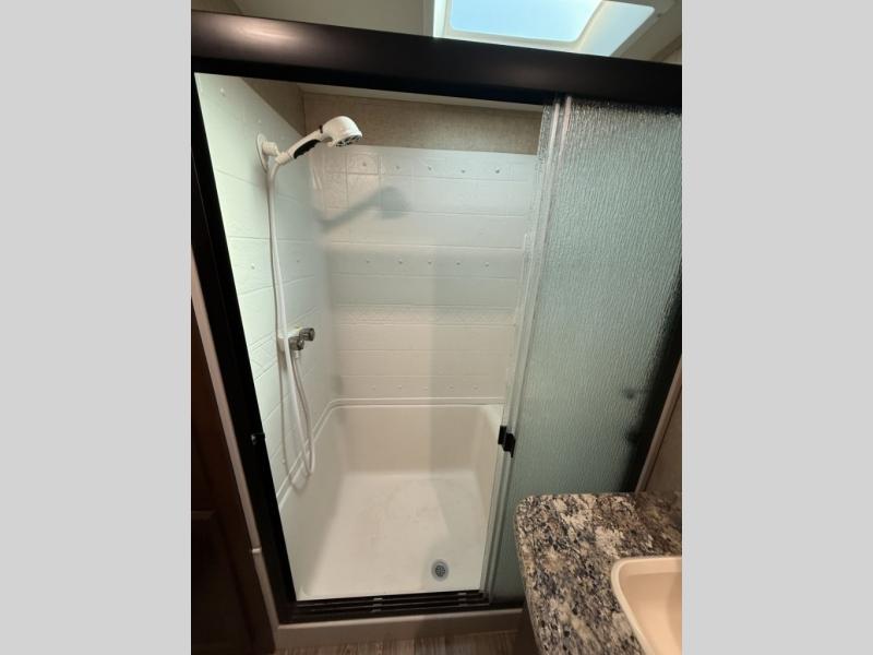 To the left of the entrance there is a slide with a free-standing table and theater seating. Along the rear wall you will find a hide-a-bed sofa. The other slide in the main living area has a pantry, microwave, three burner range, pantry, and refrigerator. Adjacent to the slide you will see a nice hutch and bench. The double kitchen sink is located in the kitchen island.