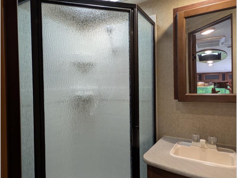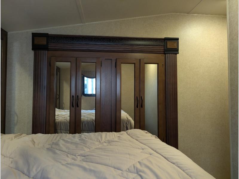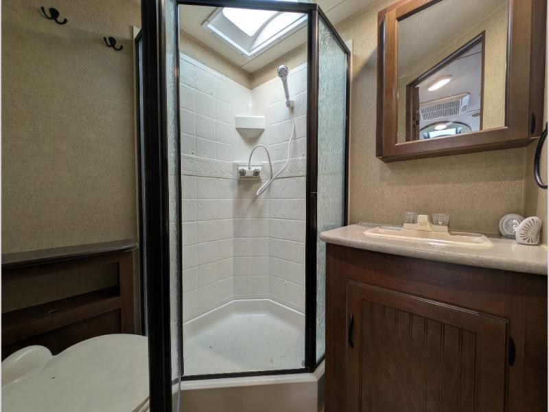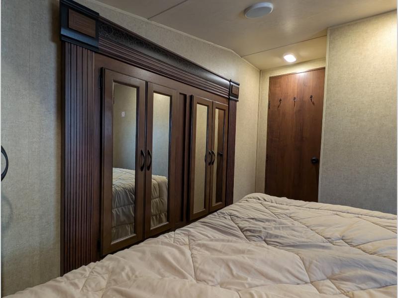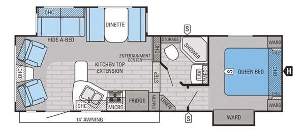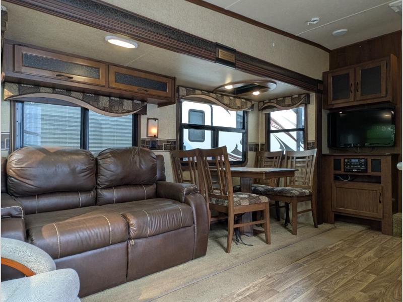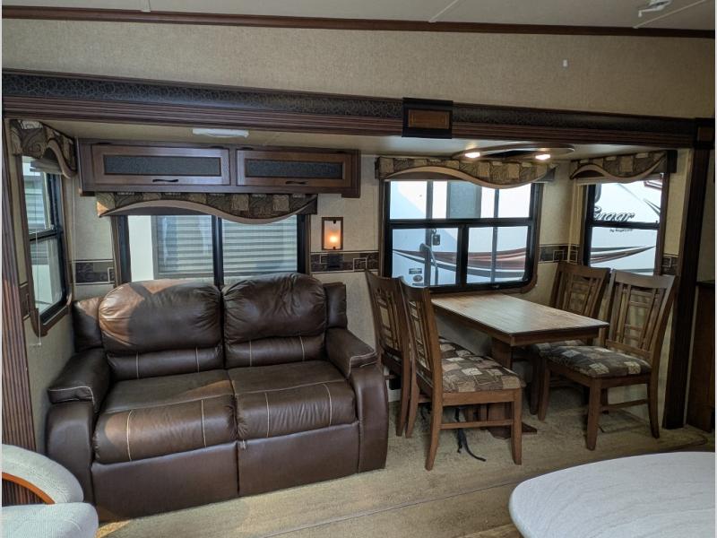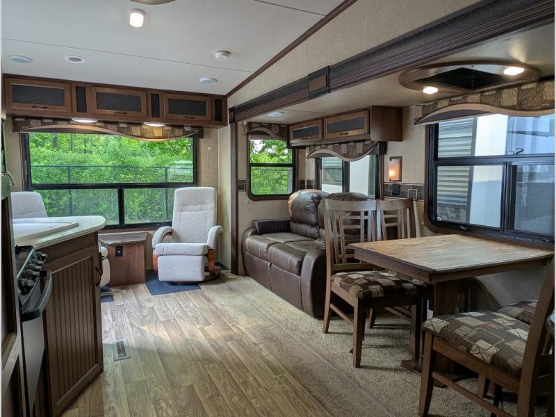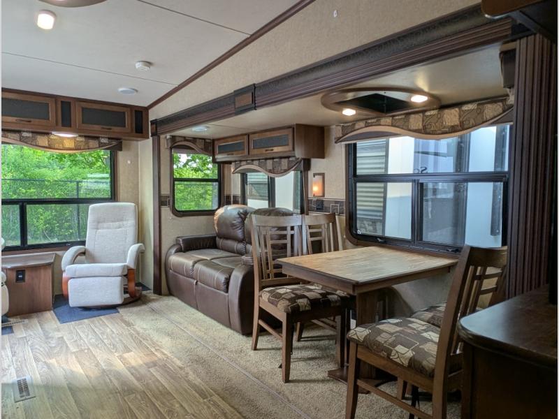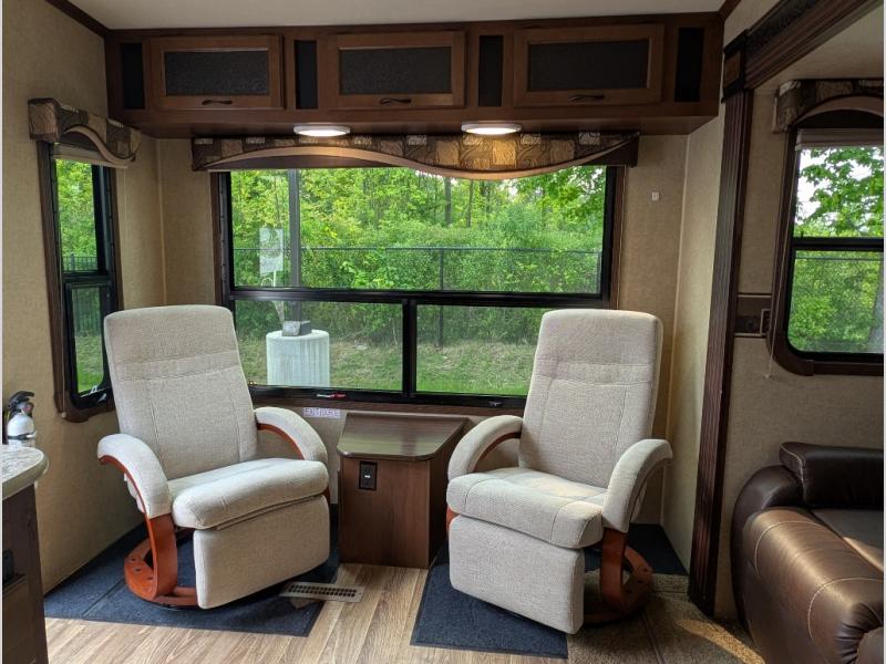 There are overhead cabinets throughout the fifth wheel, as well as exterior storage. You can even choose an optional table & chairs in place of the booth dinette, and you can also choose optional recliners in place of the lounge chairs.