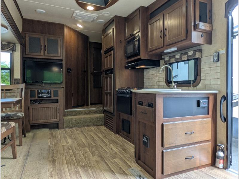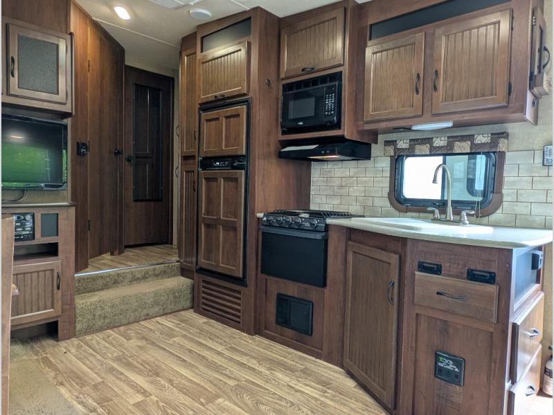 When you enter the 26.5RLS you will be in the rear of the fifth wheel. There are two lounge chairs, a slide with a hide-a-bed and dinette slide, and an entertainment center along one slide. The kitchen area has a counter extension for more space, a double kitchen sink, three burner range, microwave, refrigerator, and pantry.