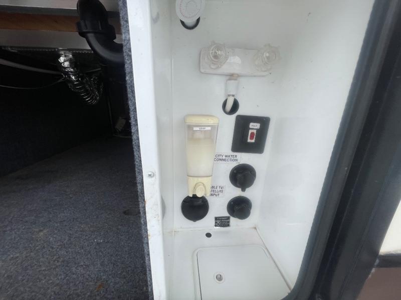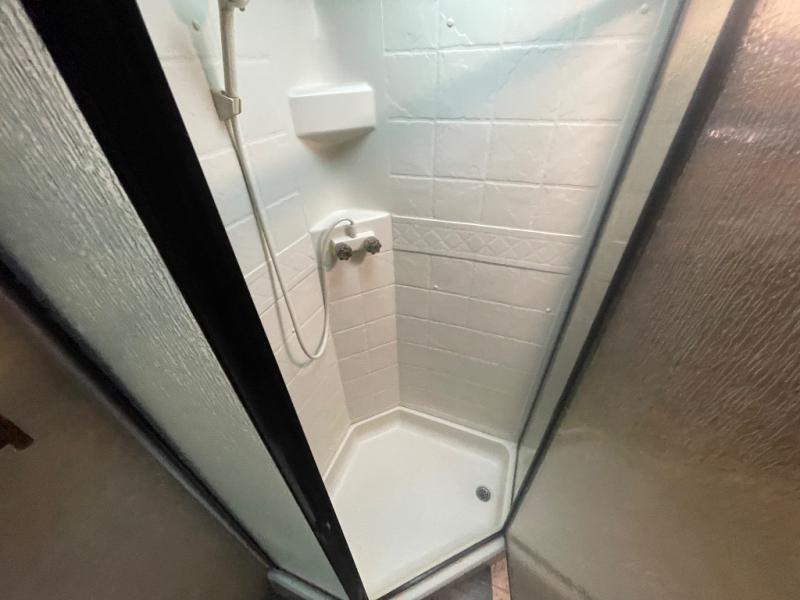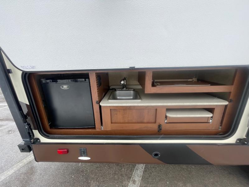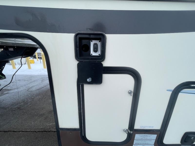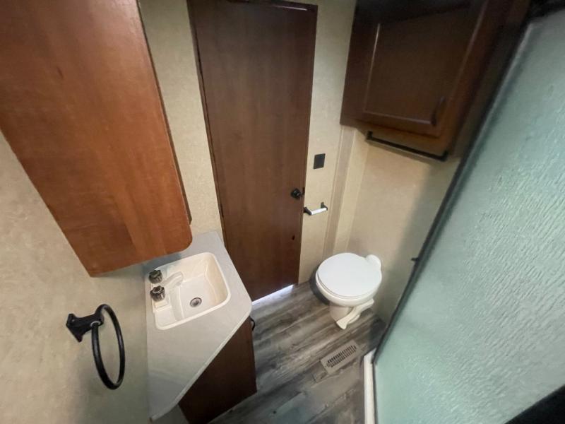 The bathroom is located in the rear of the fifth wheel. Inside the bathroom you will find a shower, toilet, sink, and medicine cabinet. There is also a private entrance leading outside from the bathroom.