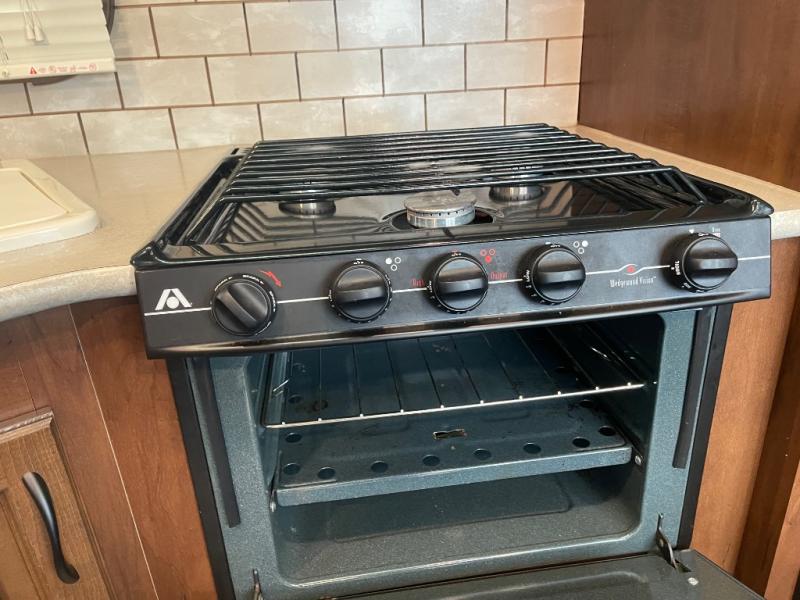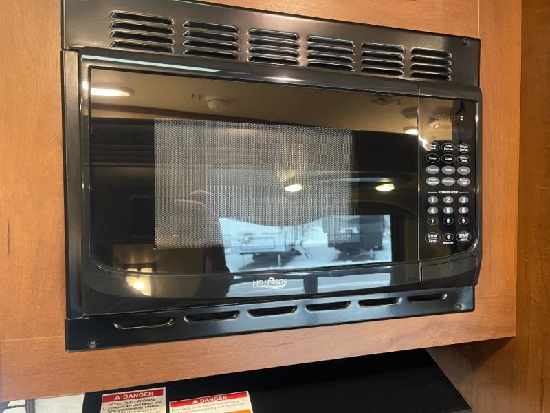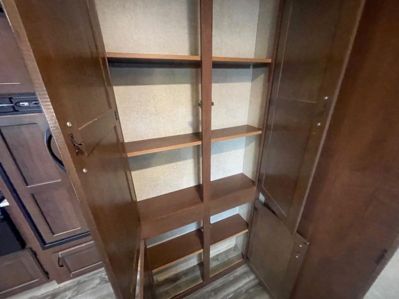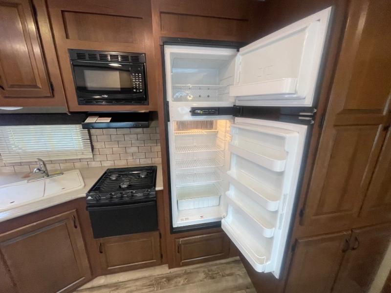 Stepping inside the fifth wheel, to the left there is a double kitchen sink, three burner range, microwave, refrigerator, and pantry. On the opposite side of the fifth wheel there is a slide with a dinette and a hide-a-bed sofa. The slide helps to open up the floor space and gives a bit more room.