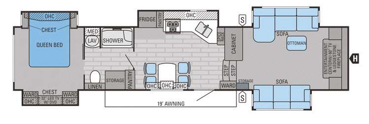In the front of the fifth wheel, as you step up the stairs, you will enter the front living area. There is a large cabinet and slide with a l-shaped sofa. Along the front wall you will find an entertainment center with fireplace. The other slide has a hide-a-bed.