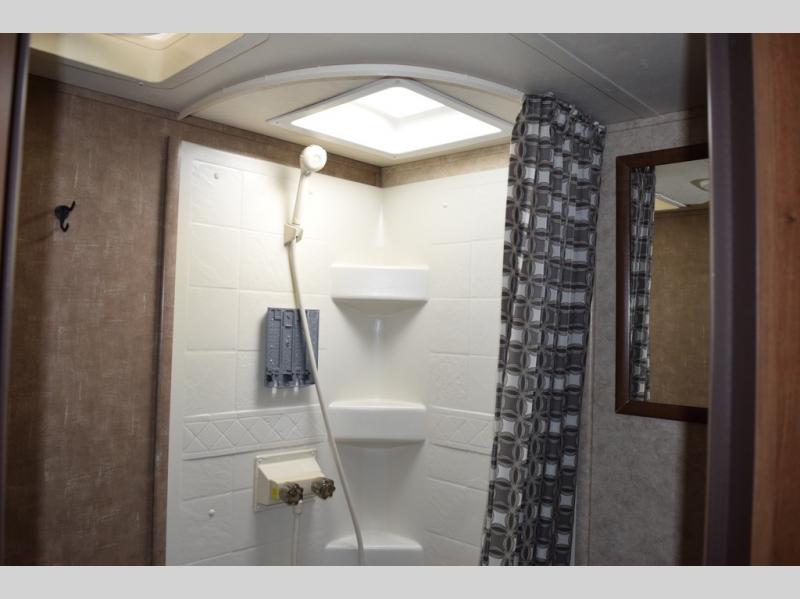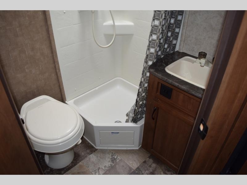The bathroom is located in the rear. You will find a toilet, corner shower, and sink.