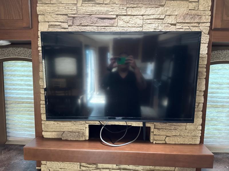 There are plenty of overhead cabinets throughout. You can even choose a few options, such as, a king bed, a hide-a-bed sofa in place of the two recliners, and a fireplace below the entertainment center.