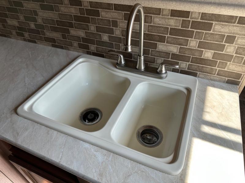 The living and kitchen areas have two slides. The first slide has two recliners, and a table and chairs. The very rear of the trailer offers a full wall entertainment center. The other slide has a hide-a-bed sofa, ottoman, pantry, refrigerator, three burner range, and microwave. There is a l-shaped counter with lots of counter space and a double kitchen sink. Unique to this destination trailer is the rolling island which can be moved where ever you need it best.