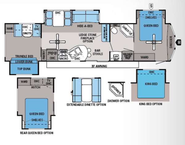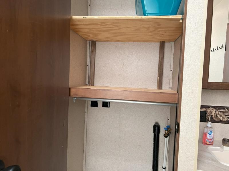 You will find plenty of overhead cabinets throughout the trailer, as well as, exterior storage.