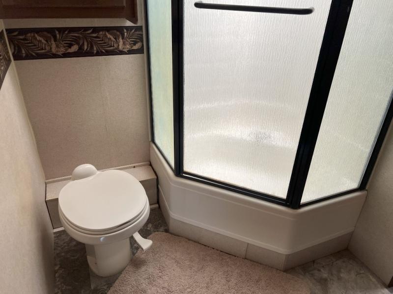 Once you enter the model, you will be in the kitchen and living areas. The kitchen offers a two burner range, double kitchen sink, four burner range, microwave, refrigerator, and pantry. The opposite side has a slide with a loveseat sleeper and table w/4 chairs. In the corner there is an entertainment center, which you are sure to enjoy.