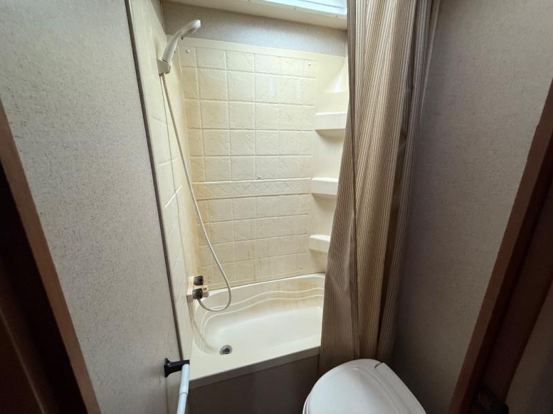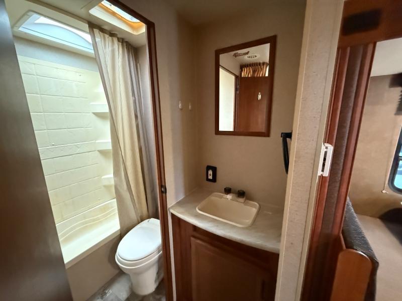 As you proceed toward the rear of the trailer you will come to the rear bathroom. Inside the bathroom there is a toilet, tub/shower. Just outside of the bathroom is the sink.