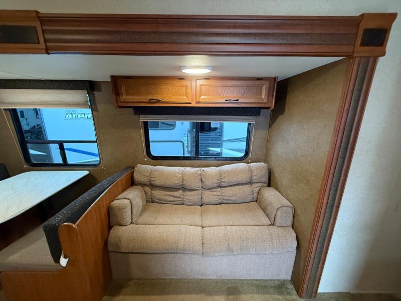 Stepping inside the travel trailer, to the left you will find a double kitchen sink, three burner range, microwave, refrigerator and large pantry. The opposite side of the trailer features a slide with a dinette and a sofa. Along the front of the living area you will see a large entertainment center.