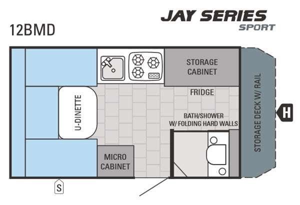 Even before you enter the Jay Series Sport 12BMD folding pop-up camper by Jayco, check out the front storage deck with rail. You can easily store a bike or two.