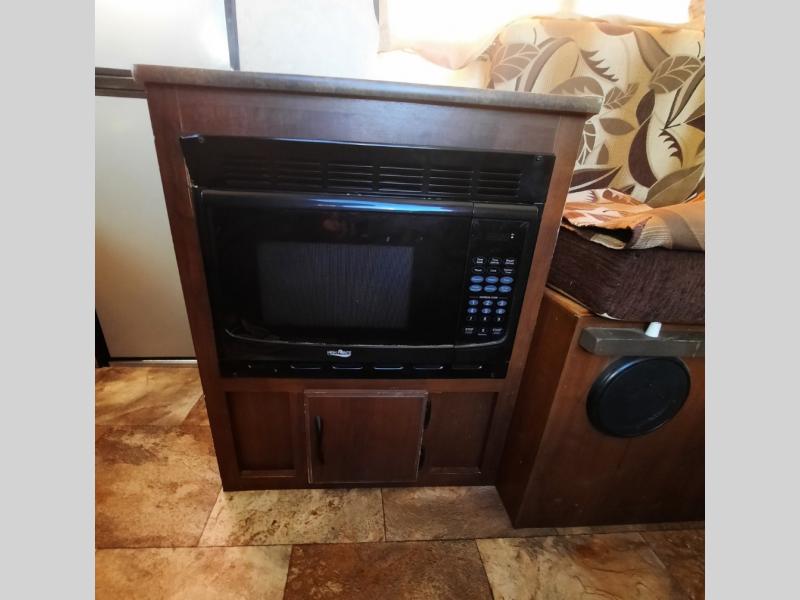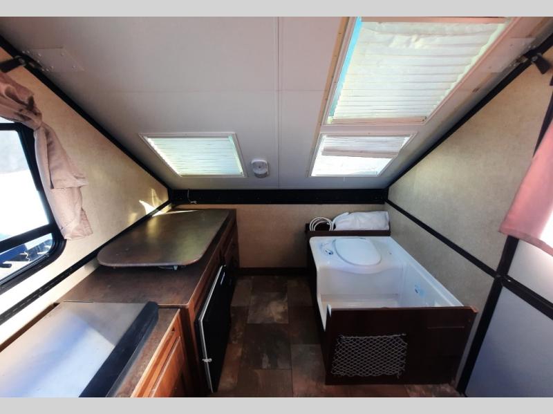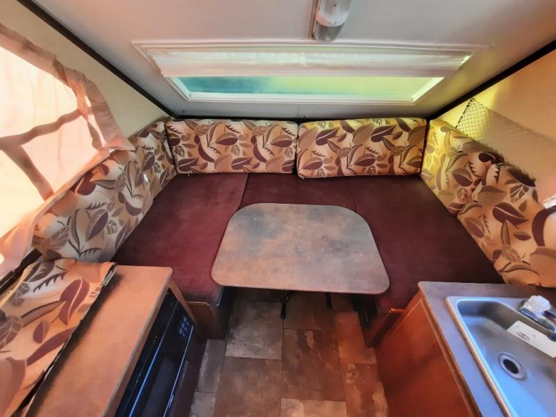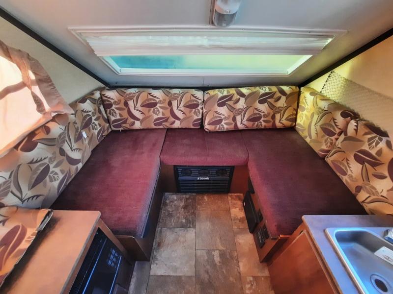 This A-frame trailer is just the right size for someone wanting to go camping or hunting with the bare necessities. There is a mini fridge, microwave and 3 burner-stove for all your cooking needs. The u-dinette turns into sleeping space. It is the perfect, small compact camper for an easy tow.