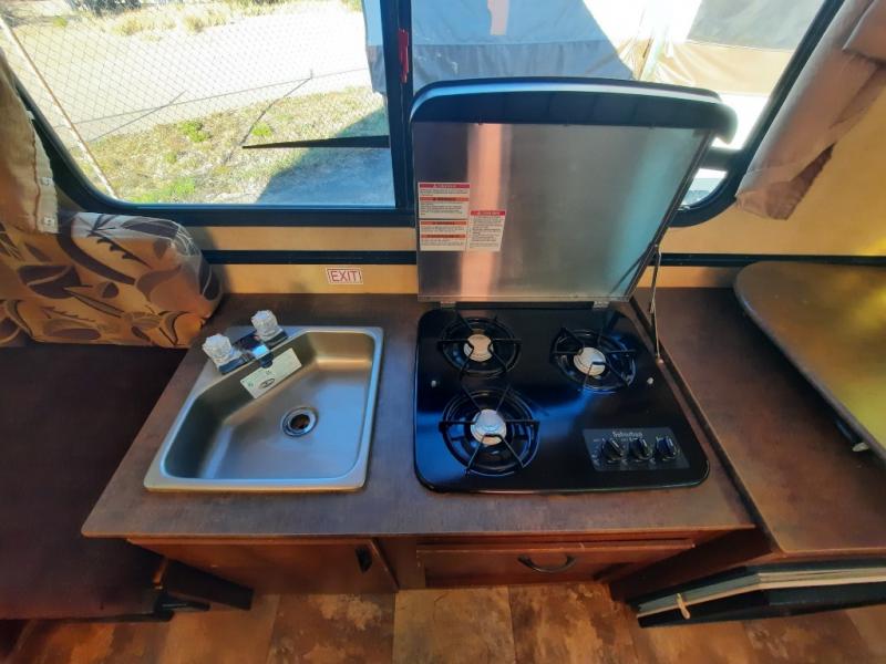 Along the rear wall you can sit and eat your meals at the u-dinette. There is a sink, three burner range, storage cabinet, and refrigerator along one side of the camper.