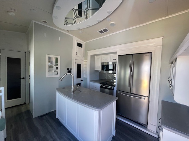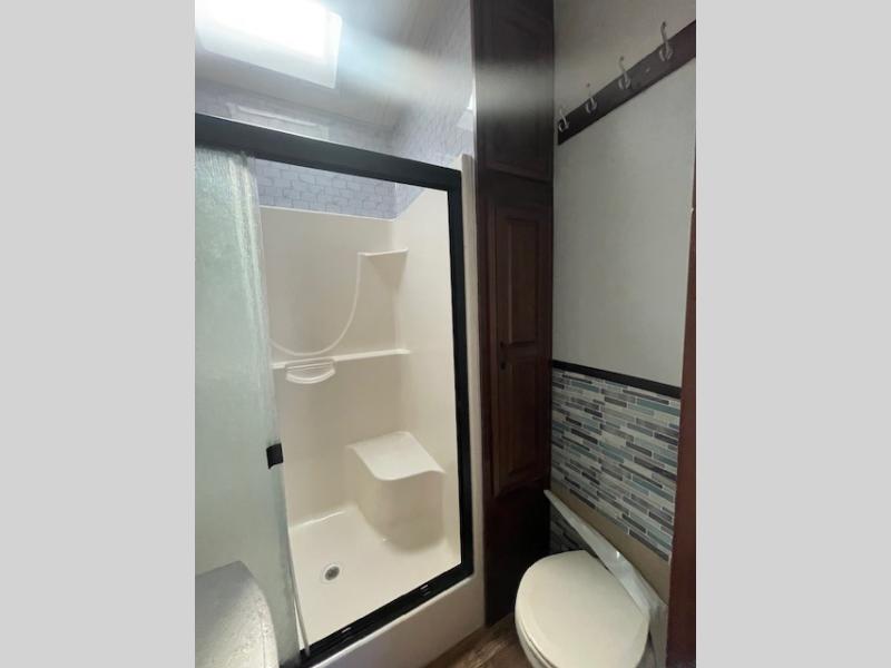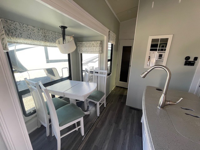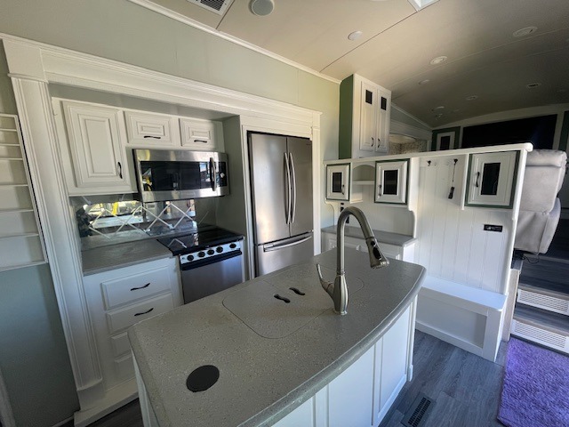 As you enter the front entrance, to the left there is a slide with a free-standing table and chairs. The opposite side of the kitchen has a slide with a three burner range, microwave, and refrigerator. Next to the slide you will find a pantry which is ideal for storing your dry goods. The kitchen island provides extra counter space and a double kitchen sink.