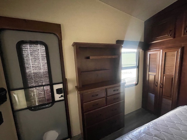 In the rear bedroom there is a king bed slide, walk-in closet, storage/washer/dryer prep, and a chest with a 32" LED TV with DVD above the chest.