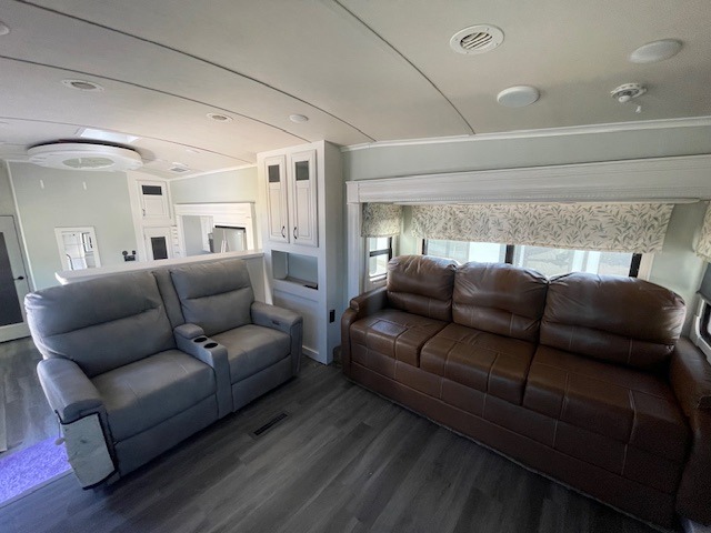 The Pinnacle 38FLSA fifth wheel by Jayco features five slides, two entrances, and a front living area.