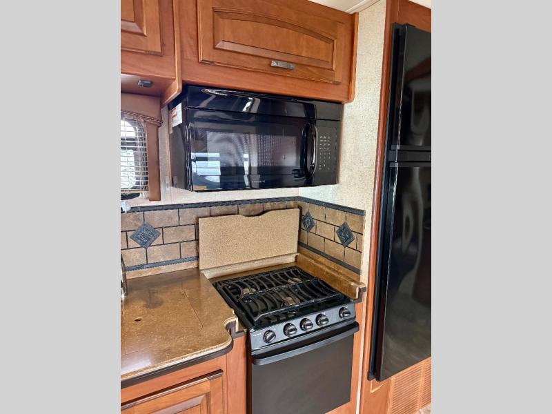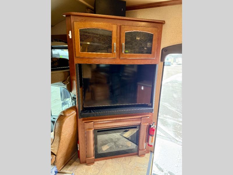 To the left of the entrance there is a corner entertainment center with fireplace. Above the cab you will find a queen bed with storage on either end of the bed.