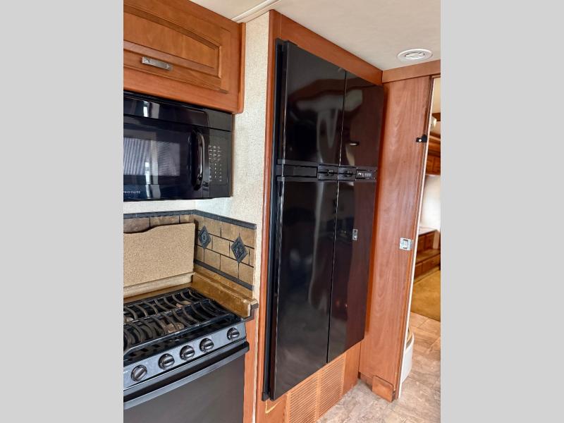 One side of the motor home has a slide with a dinette and dinette ensemble or there is an optional booth dinette and hide-a-bed. On the opposite side of the motor home you will find a double kitchen sink, three burner range, and refrigerator.