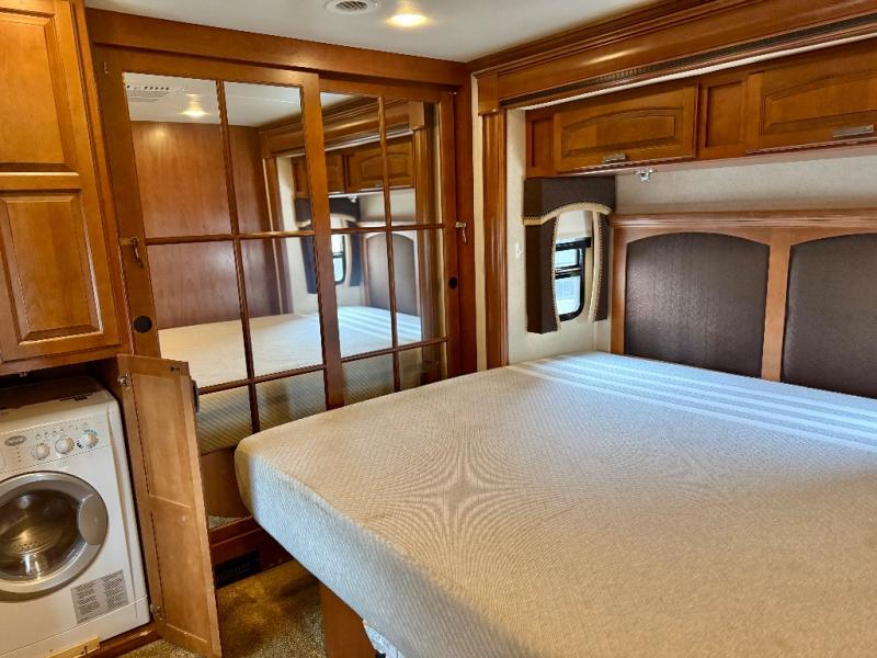 In the rear bedroom there are two slides. The king bed is on one slide and the dresser with TV cabinet is on the other slide. Along the rear wall there is extra storage with the wardrobe. You can even choose an optional washer/dryer.