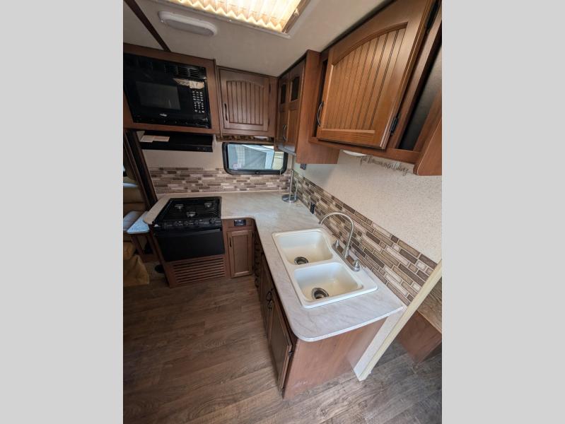 As you enter the travel trailer to the left is a refrigerator and booth dinette. The opposite side has a double kitchen sink, lots of counter space, a three burner range, microwave, and a sofa slide.