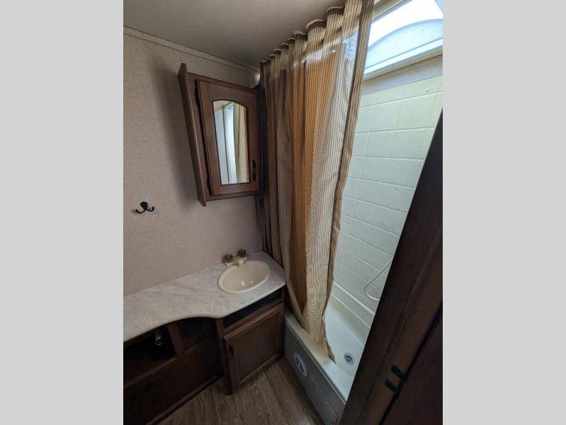 In the rear of the travel trailer there you will find a tub/shower, sink, medicine cabinet, toilet, and linen cabinet.