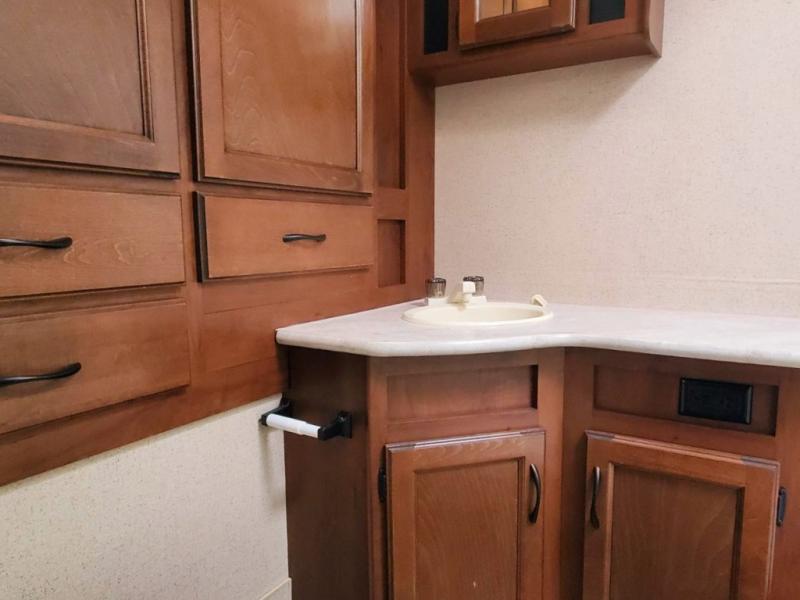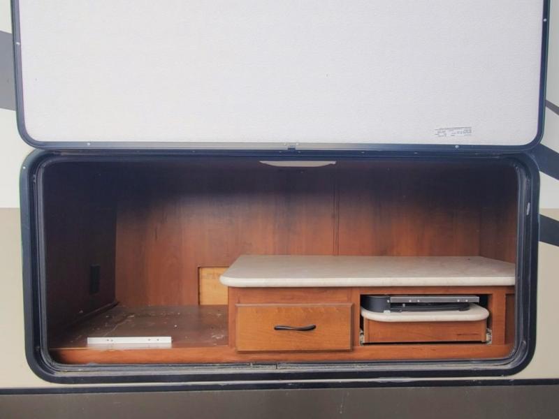 There are plenty of overhead cabinets throughout the travel trailer as well as outside storage. You are also sure to enjoy the outside kitchen which has a refrigerator, pantry, and two burner range.